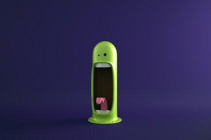 La capsule monstre verte a ouvert sa bouche pour que la langue soit visibleLa capsule monstre verte a ouvert sa bouche pour que la langue soit visible