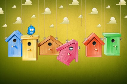 Les nichoirs colorés de bande dessinée accrochés sur des filsLes nichoirs colorés de bande dessinée accrochés sur des fils