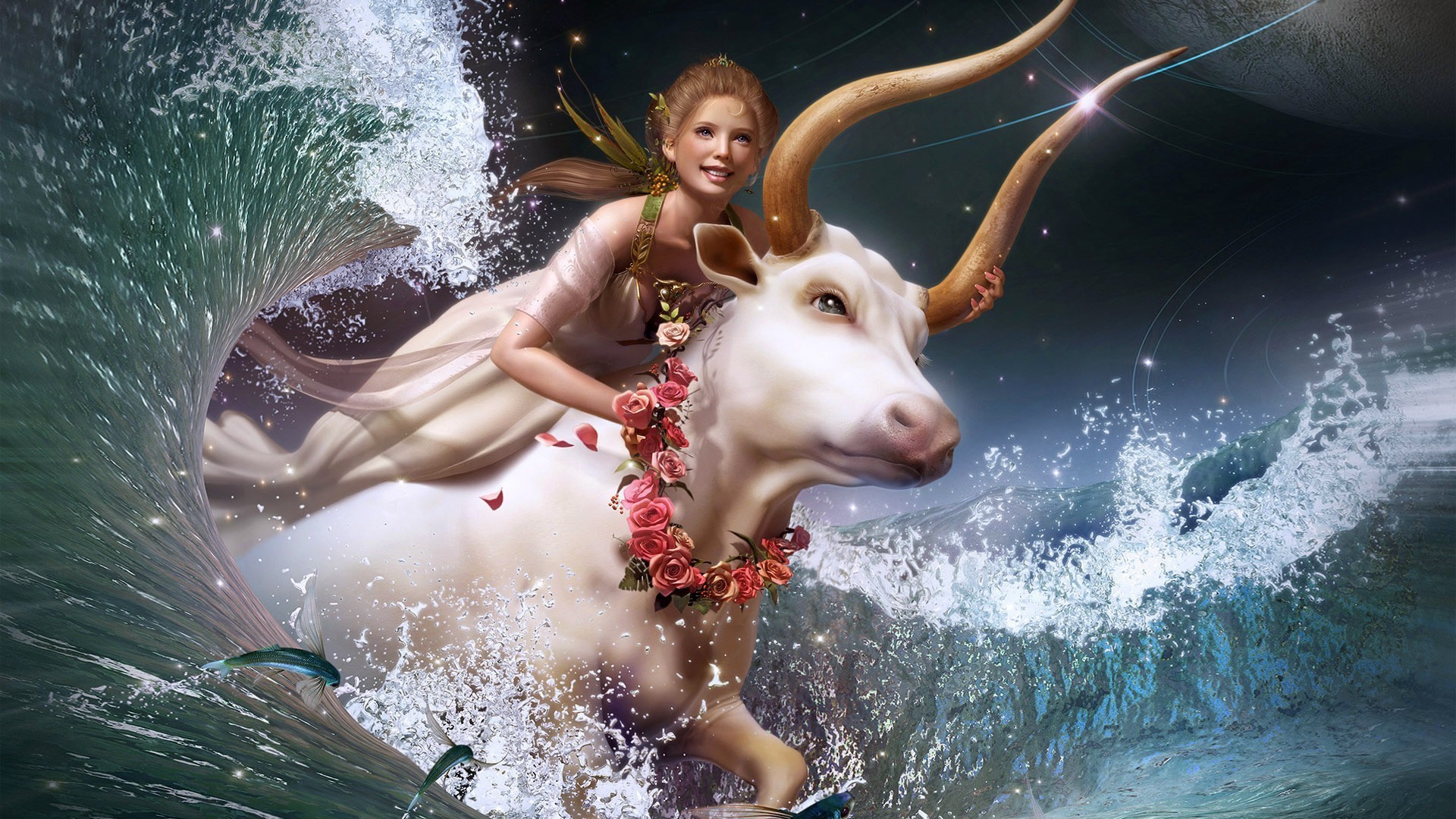 Fille dans l eau à cheval sur un Taureau - fond d'écran de téléphone