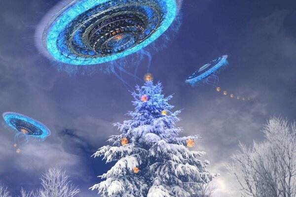 Soucoupes volantes extraterrestres sur fond d arbre de Noël