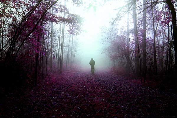 Homme solitaire à l'automne dans le brouillard