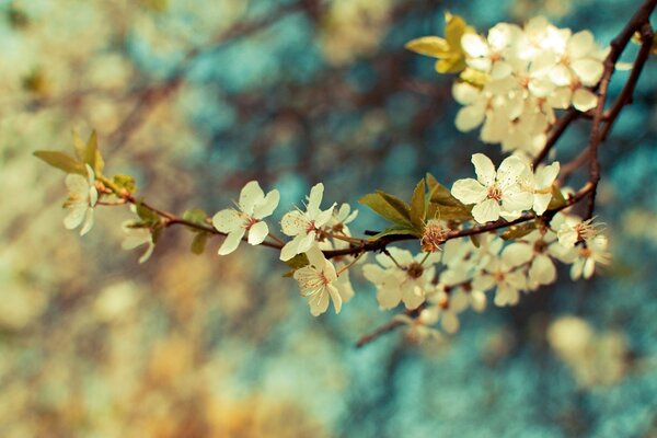 Sur une branche de pommier fleurs blanches