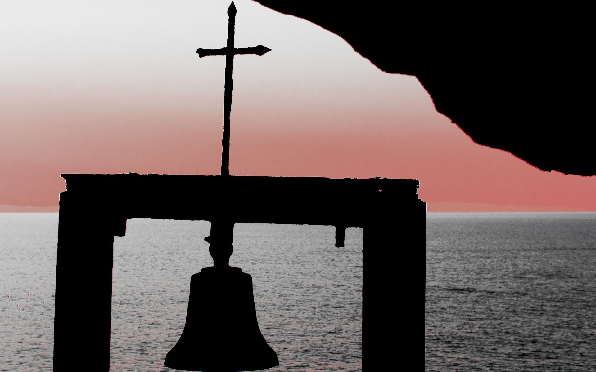 Cloche dans l'océan. Bord de mer au coucher du soleil