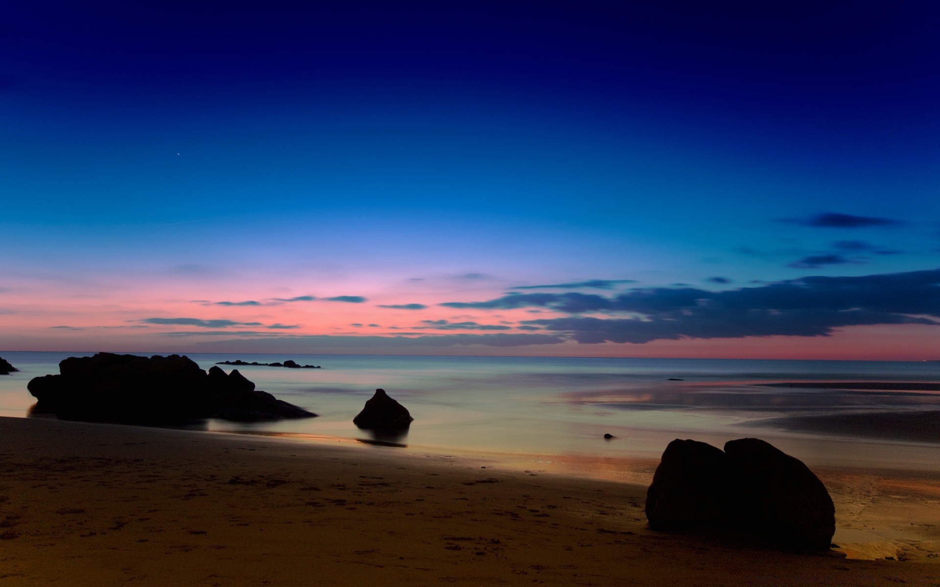 Beau paysage avec des montagnes et des arbres verts de chaque côté de la mer au coucher du soleil