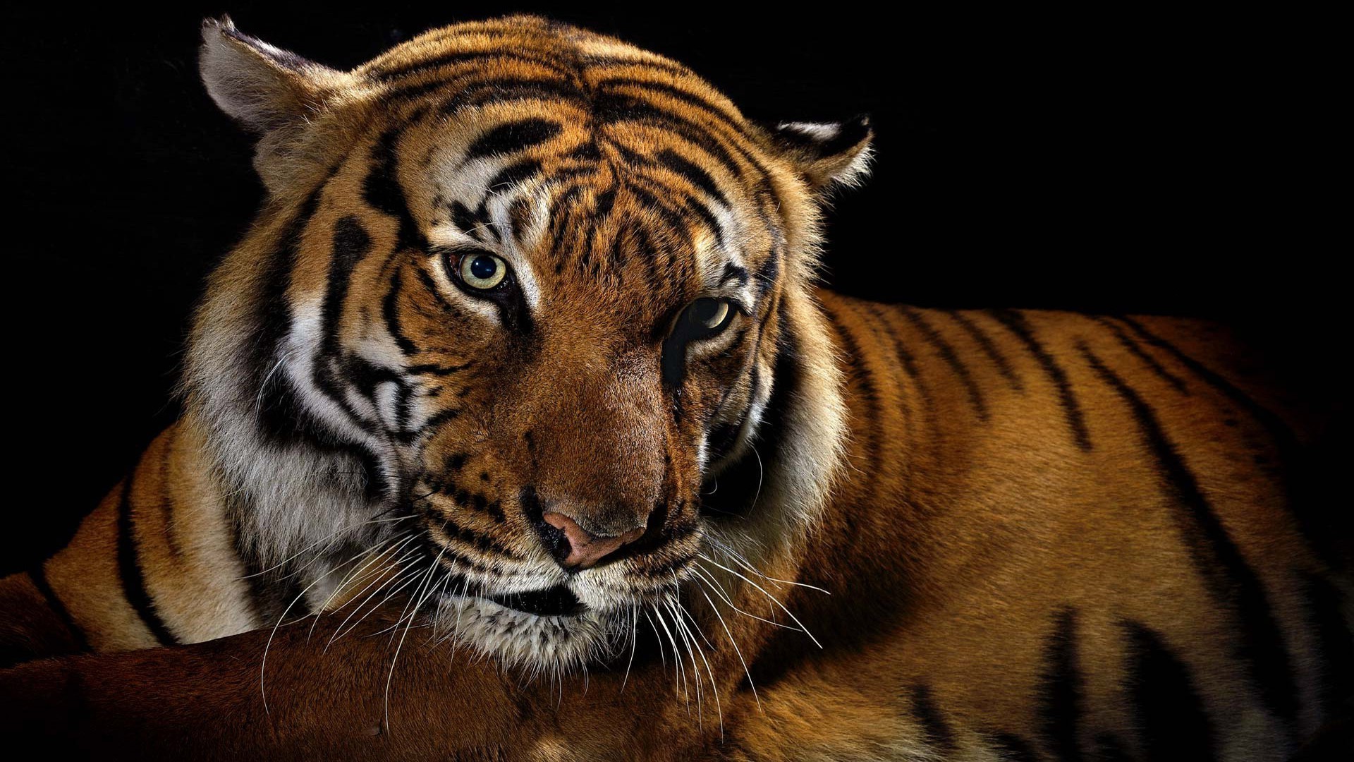 Le tigre se trouve sur l'herbe et regarde vers l'avant avec intérêt