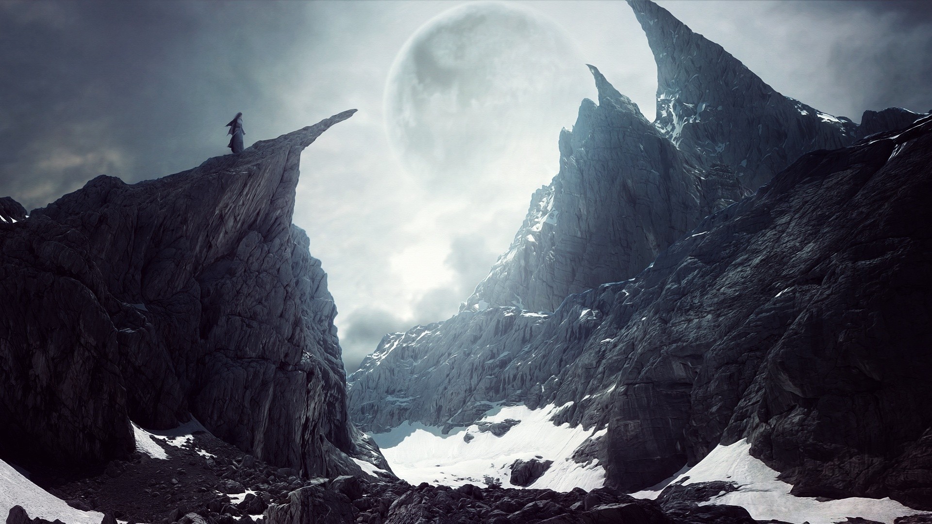 Tour sombre sur la montagne au bord de la mer sur fond de coucher de soleil de ciel noir