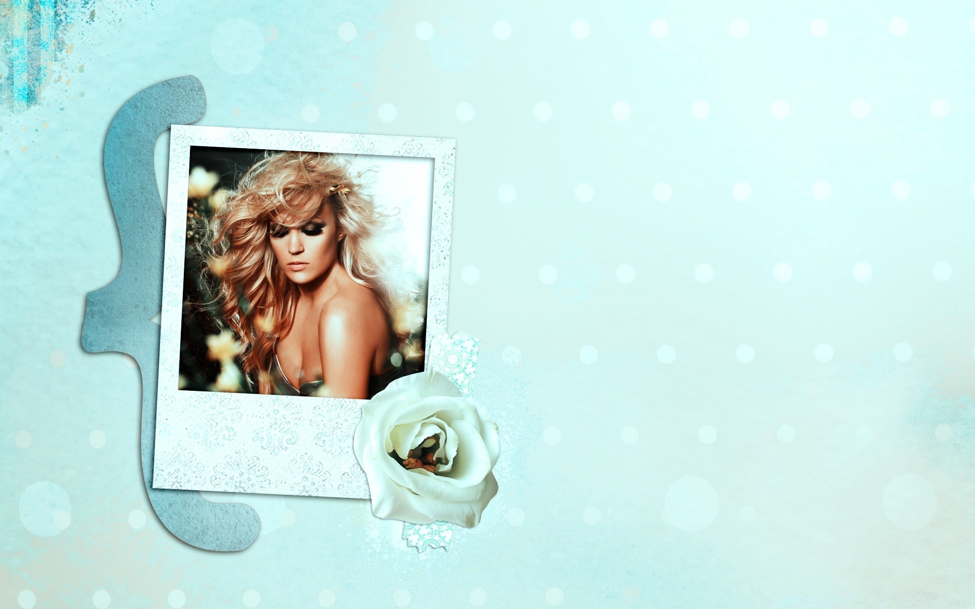 Polaroid photo d une femme blonde adulte. Photo d une femme sur un fond bleu tendre