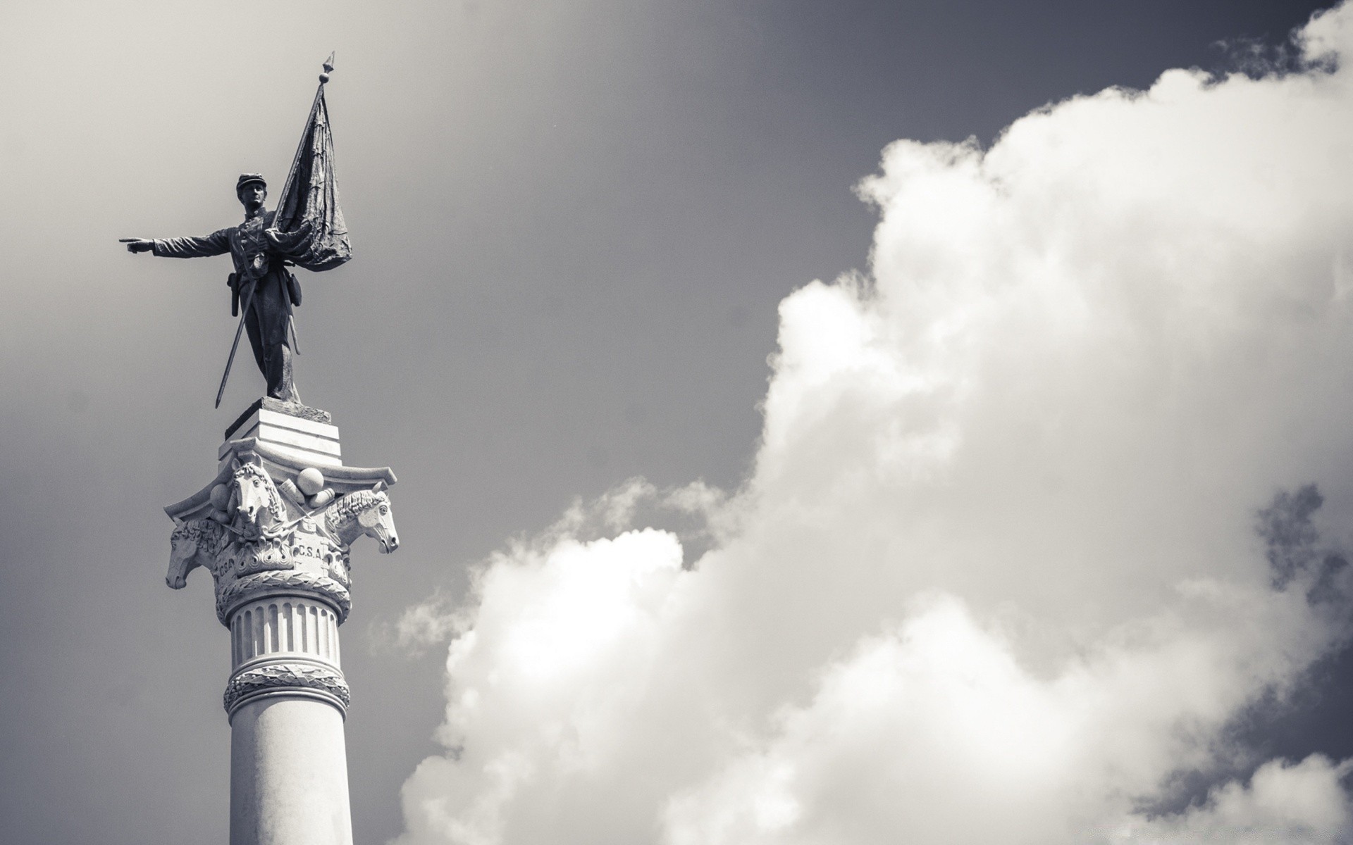 Sculpture sur piédestal avec drapeau sur fond de ciel