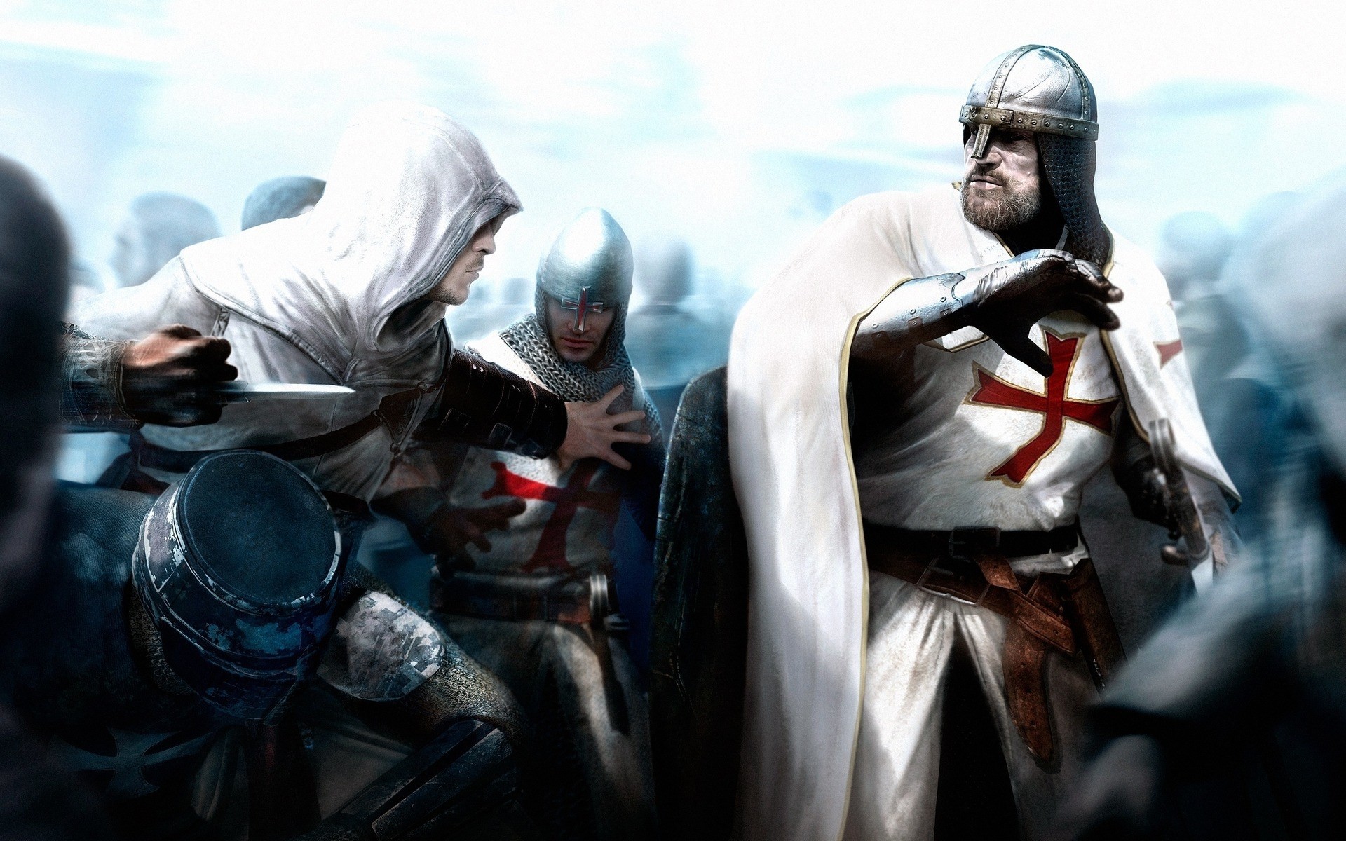 Une scène avec des guerriers et des gardiens du jeu d'ordinateur assassin's creedUne scène avec des guerriers et des gardiens du jeu d'ordinateur Assassin's creed