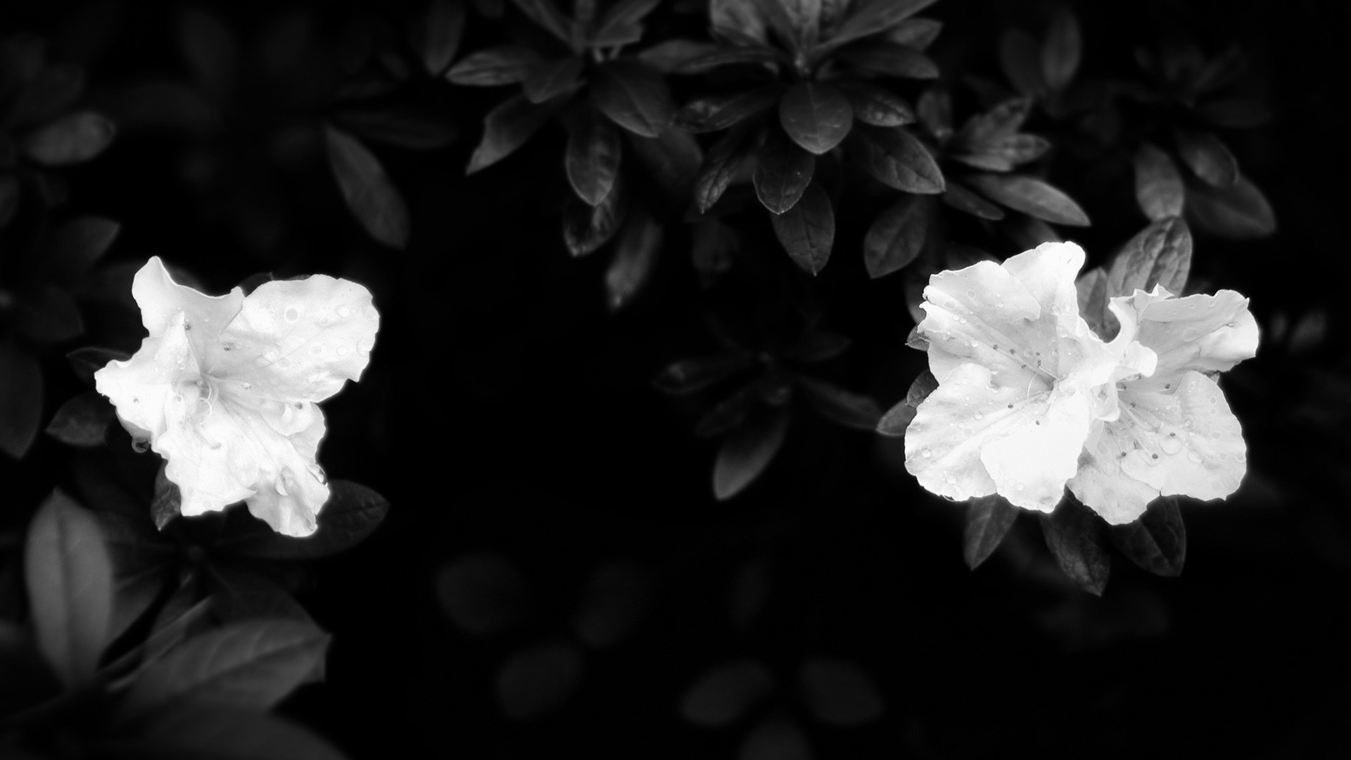 Sur la photo en noir et blanc, les fleurs d'Hibiscus se détachent sur le fond de la verdure de l'arbuste