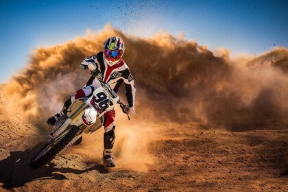 UN MOTOCYCLISTE JETTE DE LA POUSSIÈRE À LA COMPÉTITION