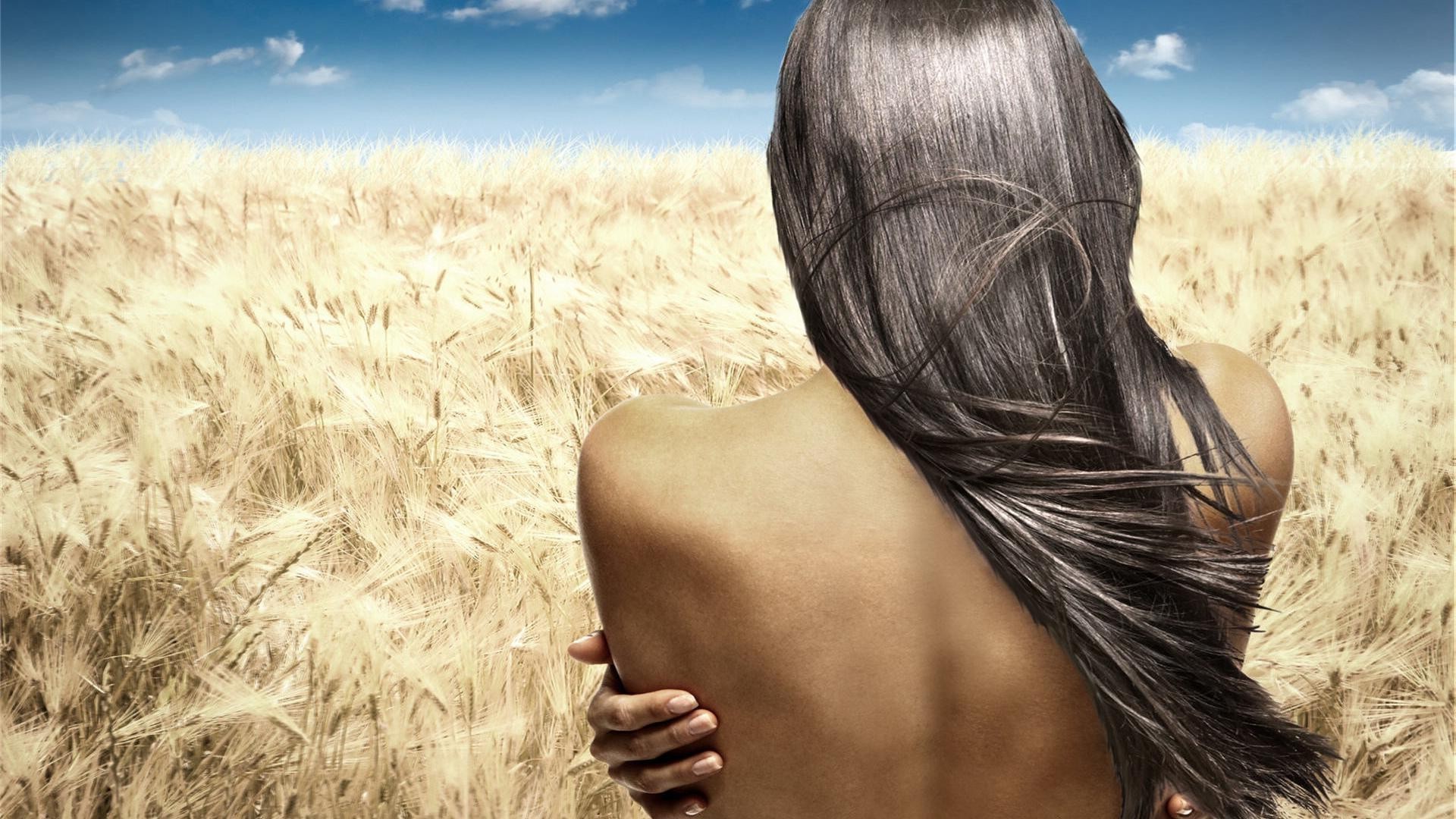 Fille nue sur fond de champ de blé