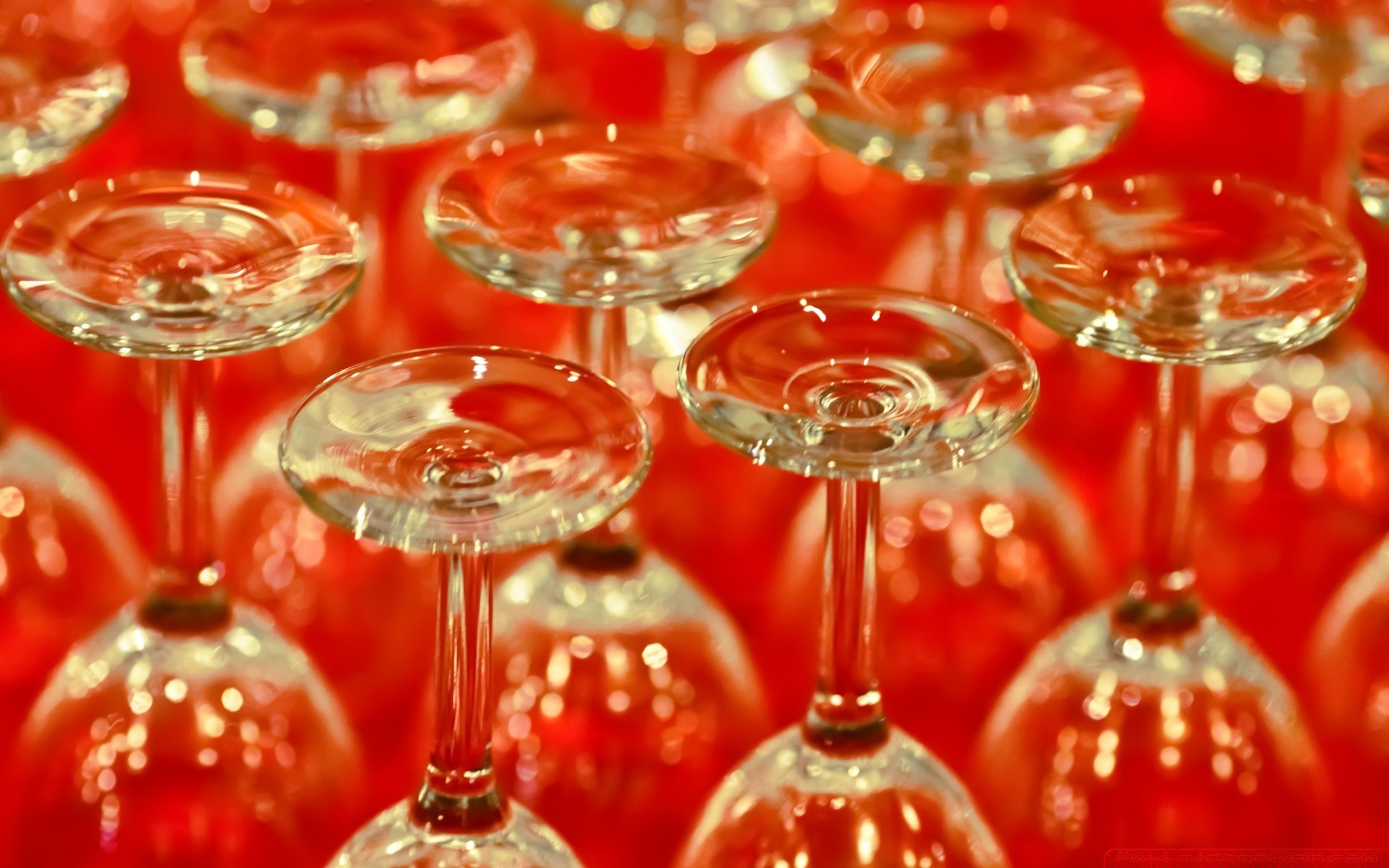 Verres à vin inversés transparents sur la table rougeVerres à vin inversés transparents sur la table rouge