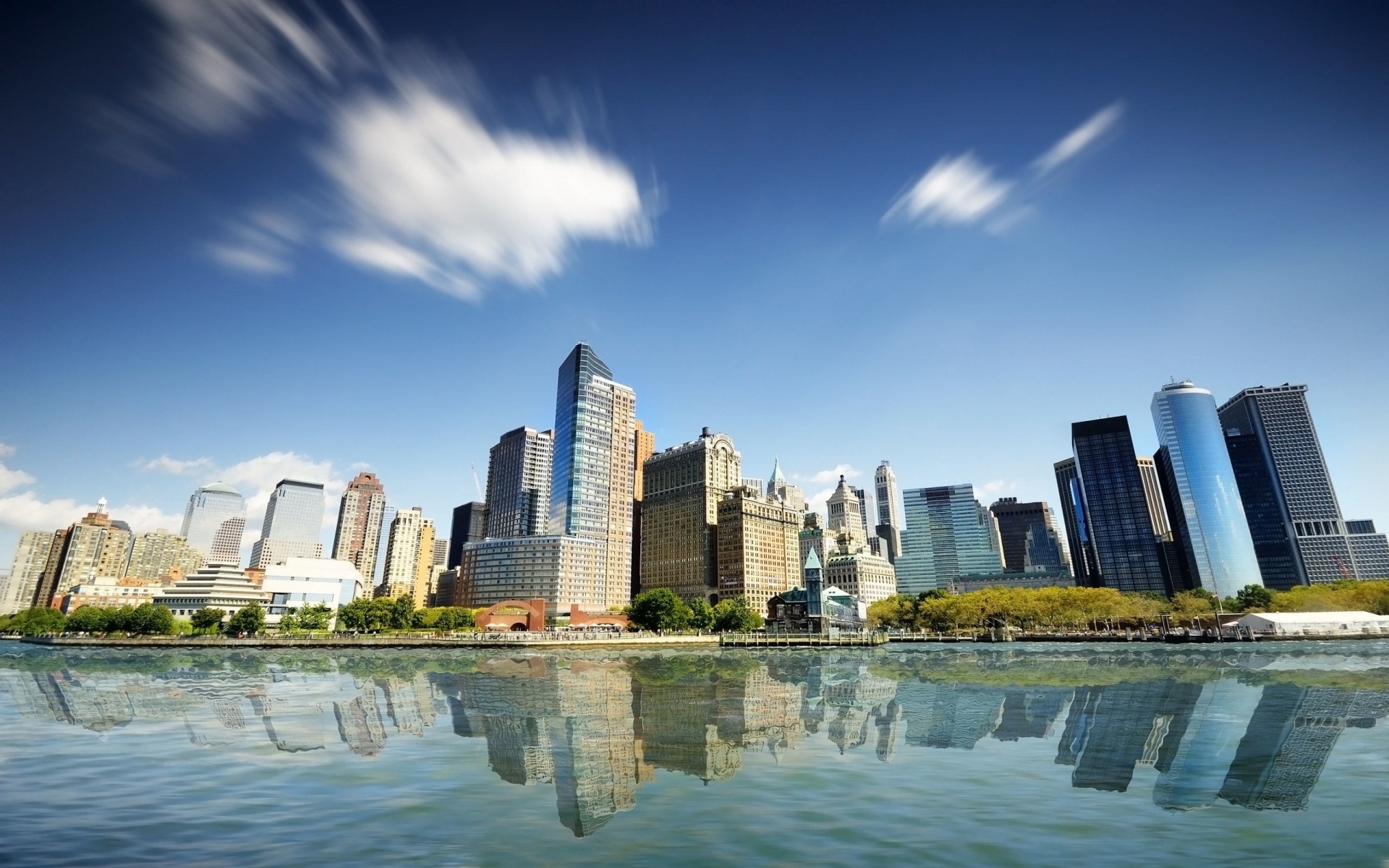 Rivière avec des ponts reliant les deux rives de la ville moderne avec des gratte-ciel