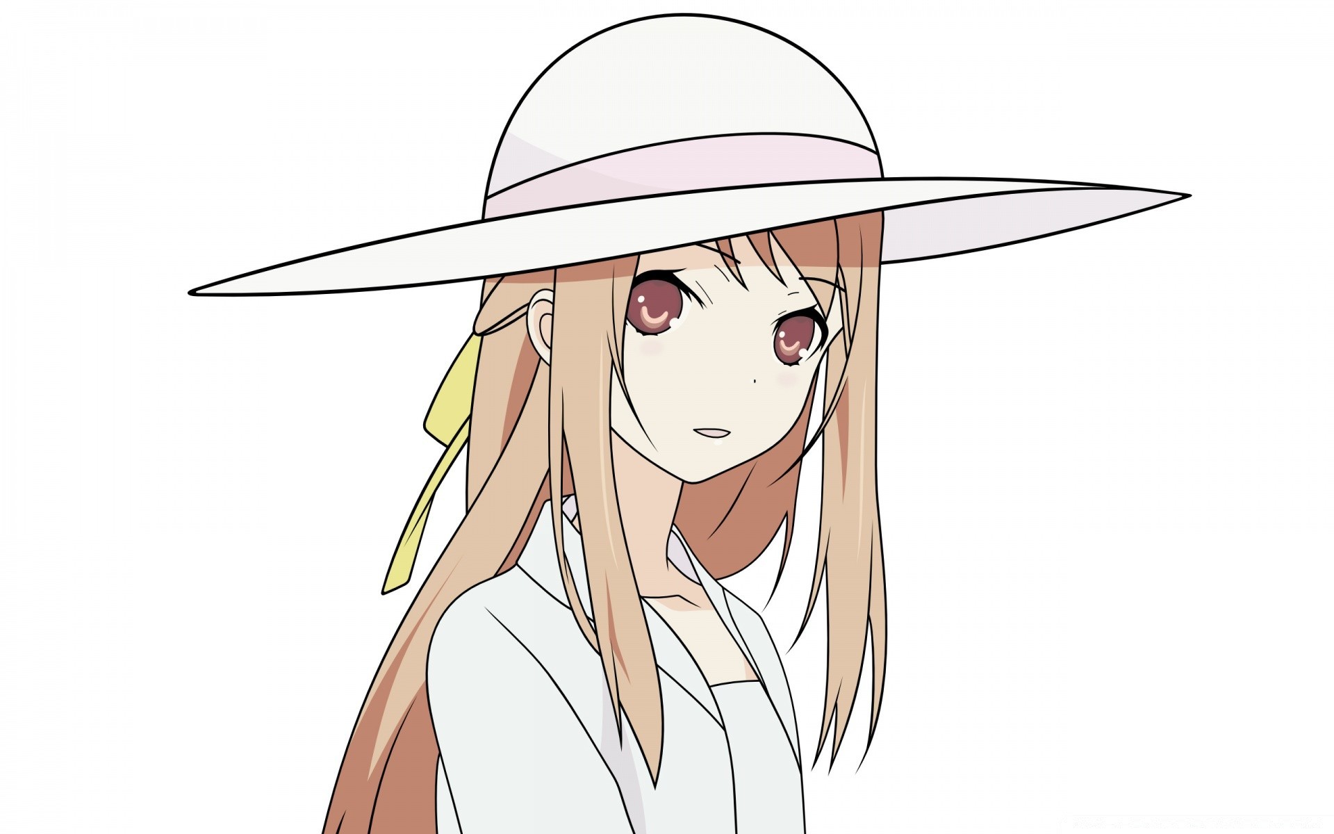 Fille de l'anime dans un chapeau sur un fond d'arbres en fleurs