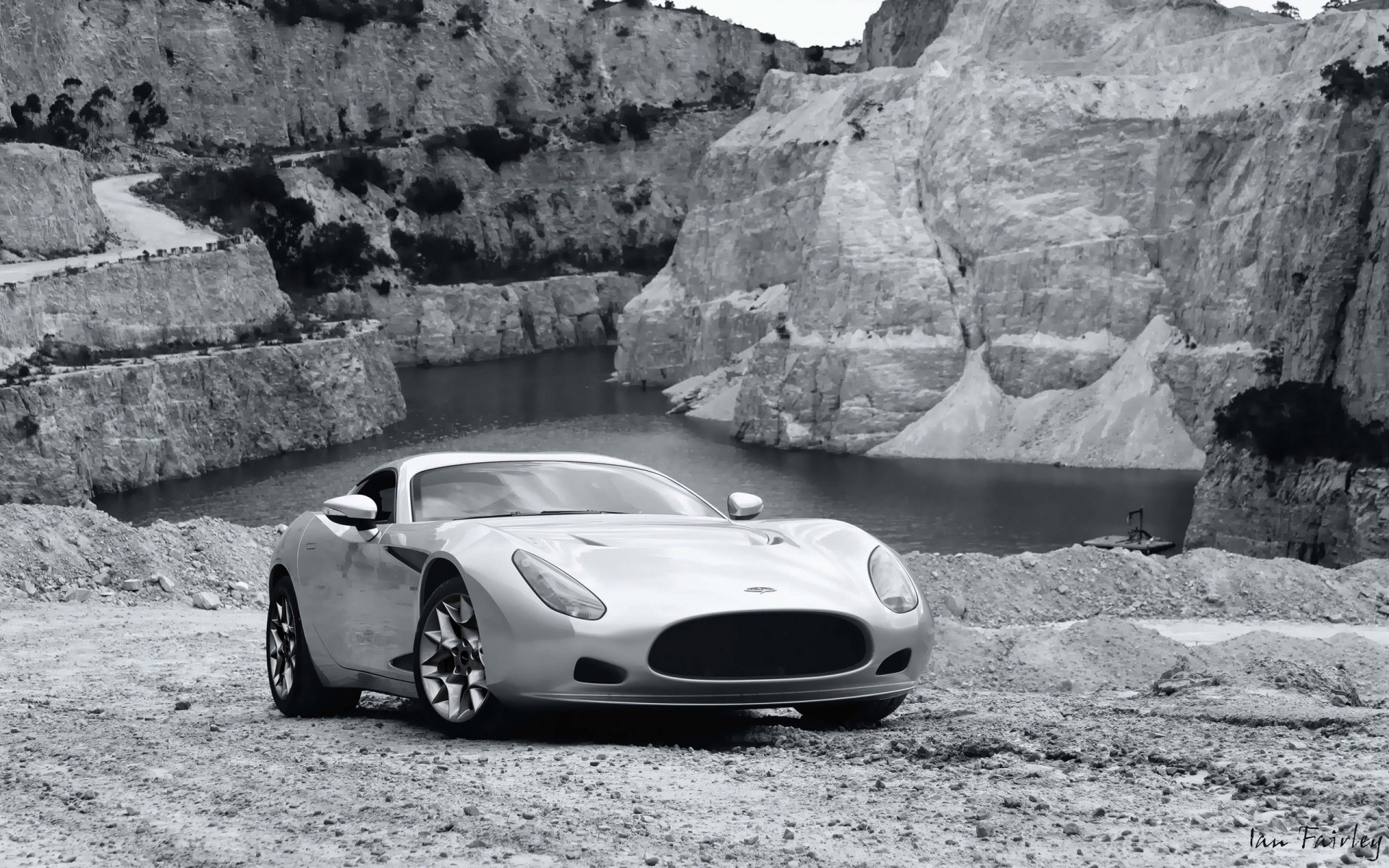 Rêve de voyage, voiture de sport argentée sur la jetéeRêve de voyage, voiture de sport argentée sur la jetée