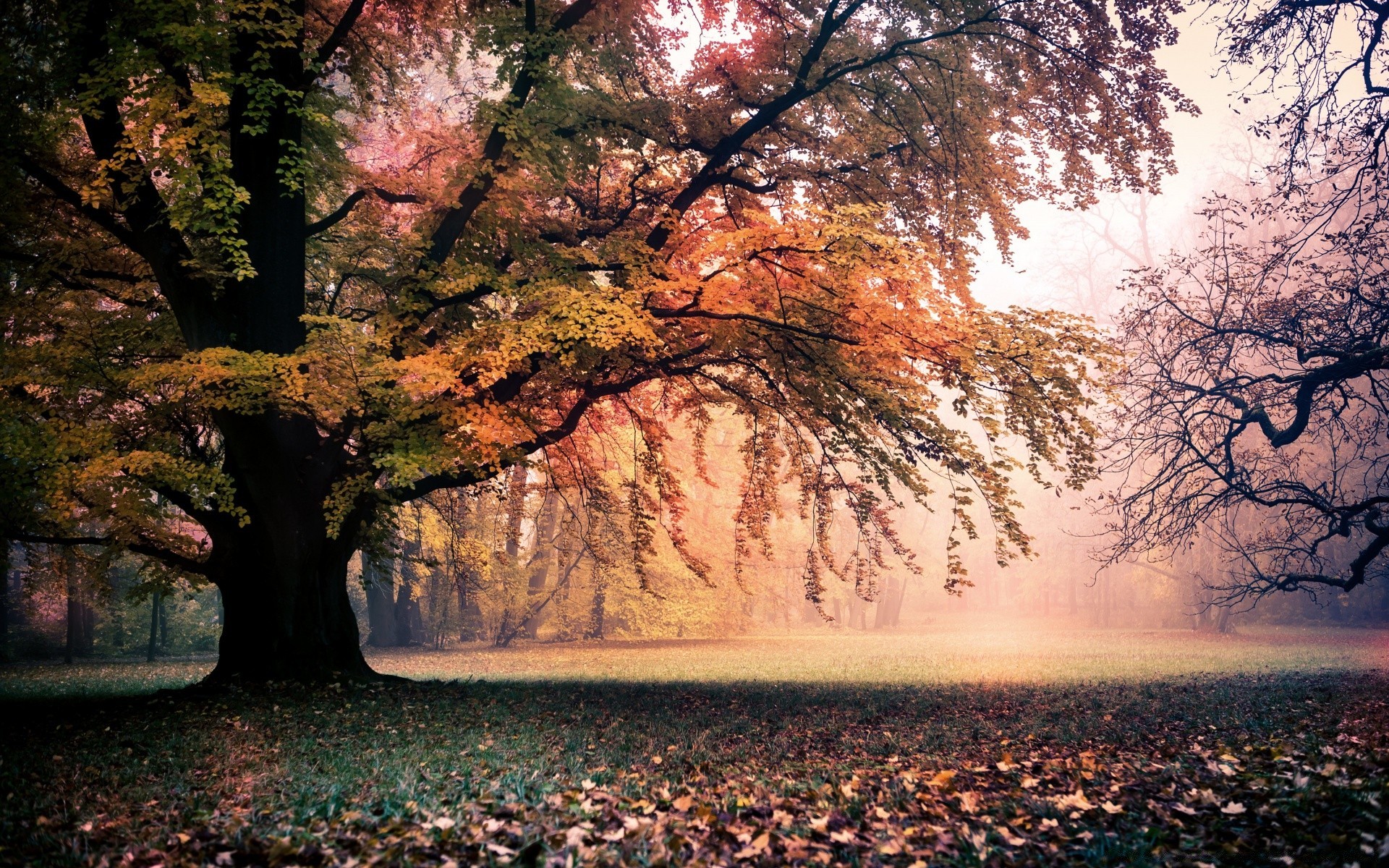 Clairière sous un grand arbre en automne