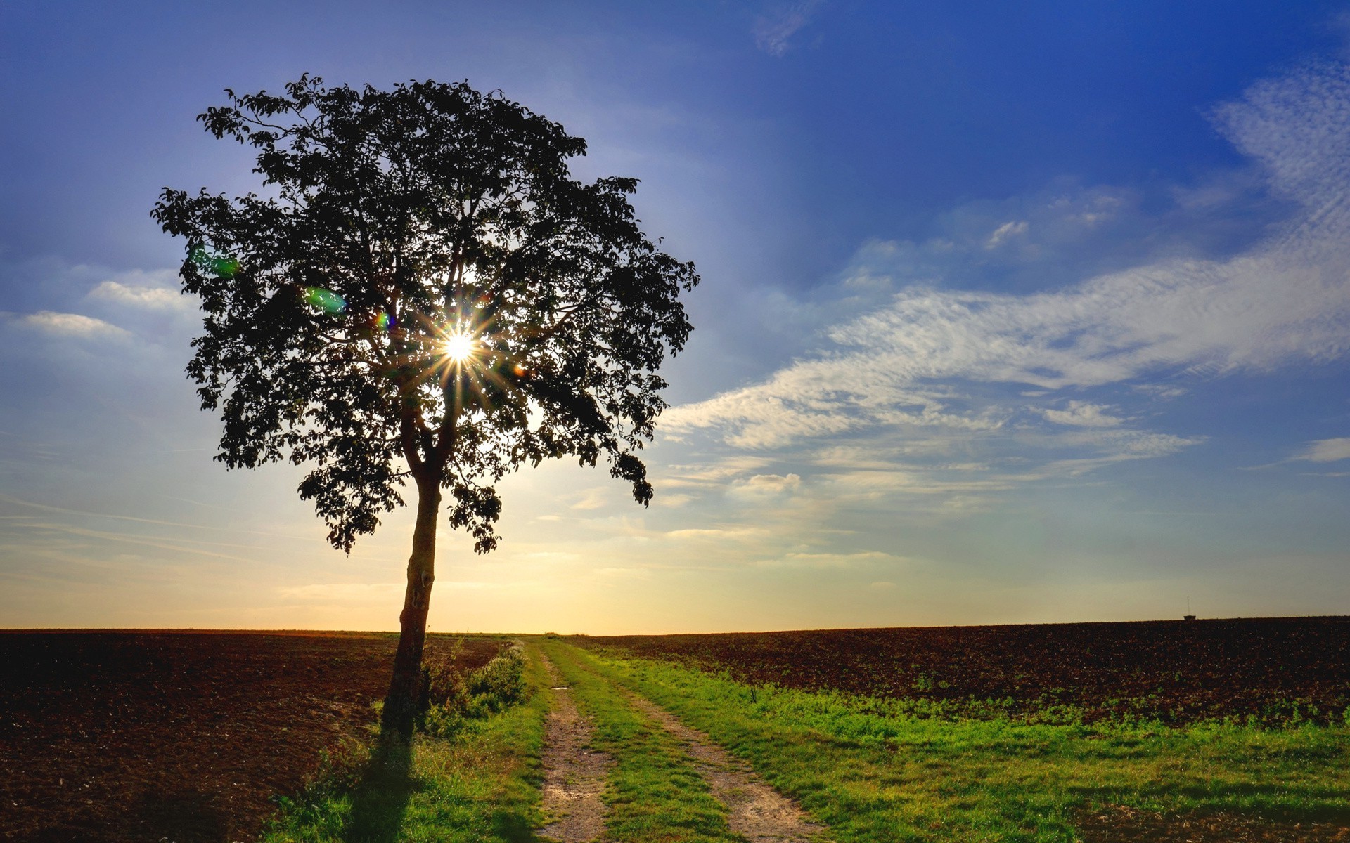 Un arbre solitaire sur le champ comme s'il enveloppait le soleilUn arbre solitaire sur le champ comme s'il enveloppait le soleil