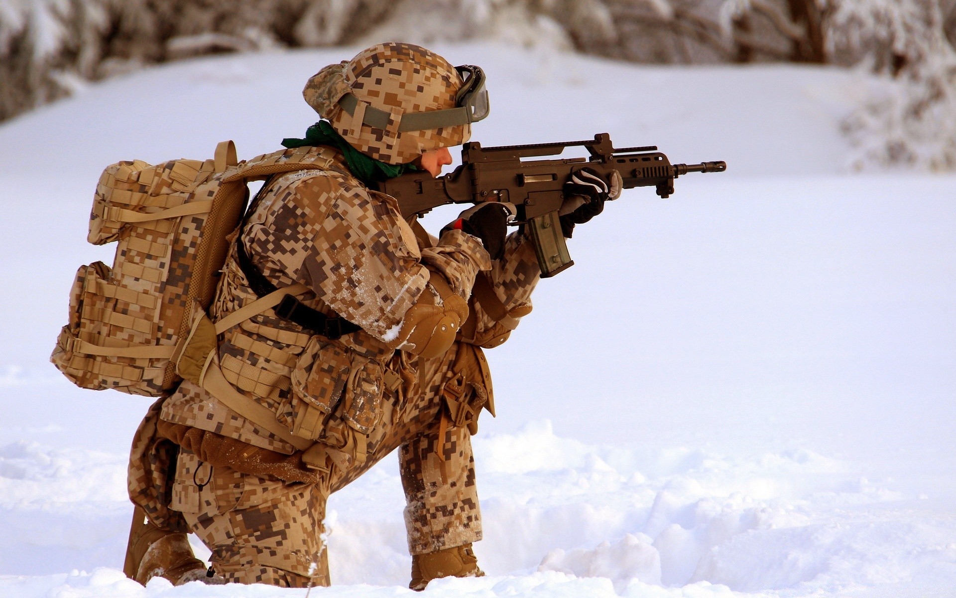 Portrait d'un personnage armé du jeu Fallout dans une combinaison de protection et un masque à gaz