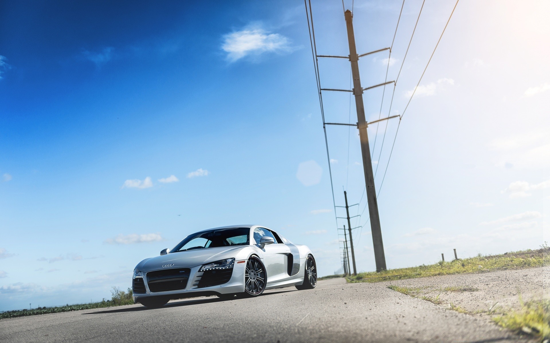 Voiture rouge sur la route sur fond de feuillage et de ciel bleu