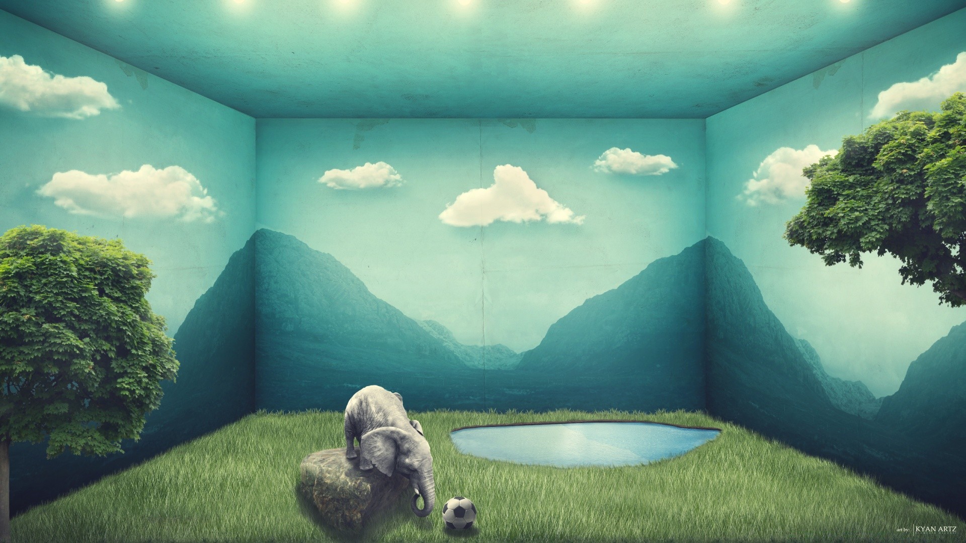 Éléphant jouant au ballon à côté d'une flaque d'eauÉléphant jouant au ballon à côté d'une flaque d'eau