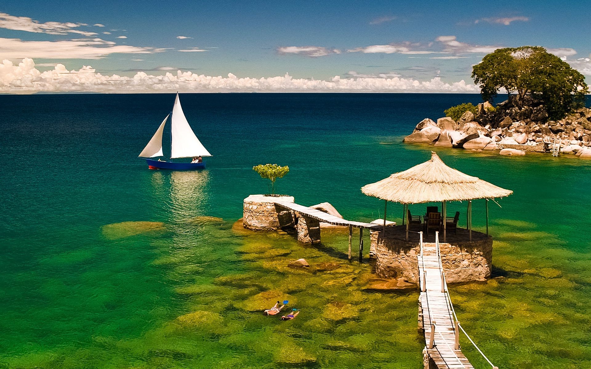 Voilier arbre et pierre îles au milieu de l'eau turquoise