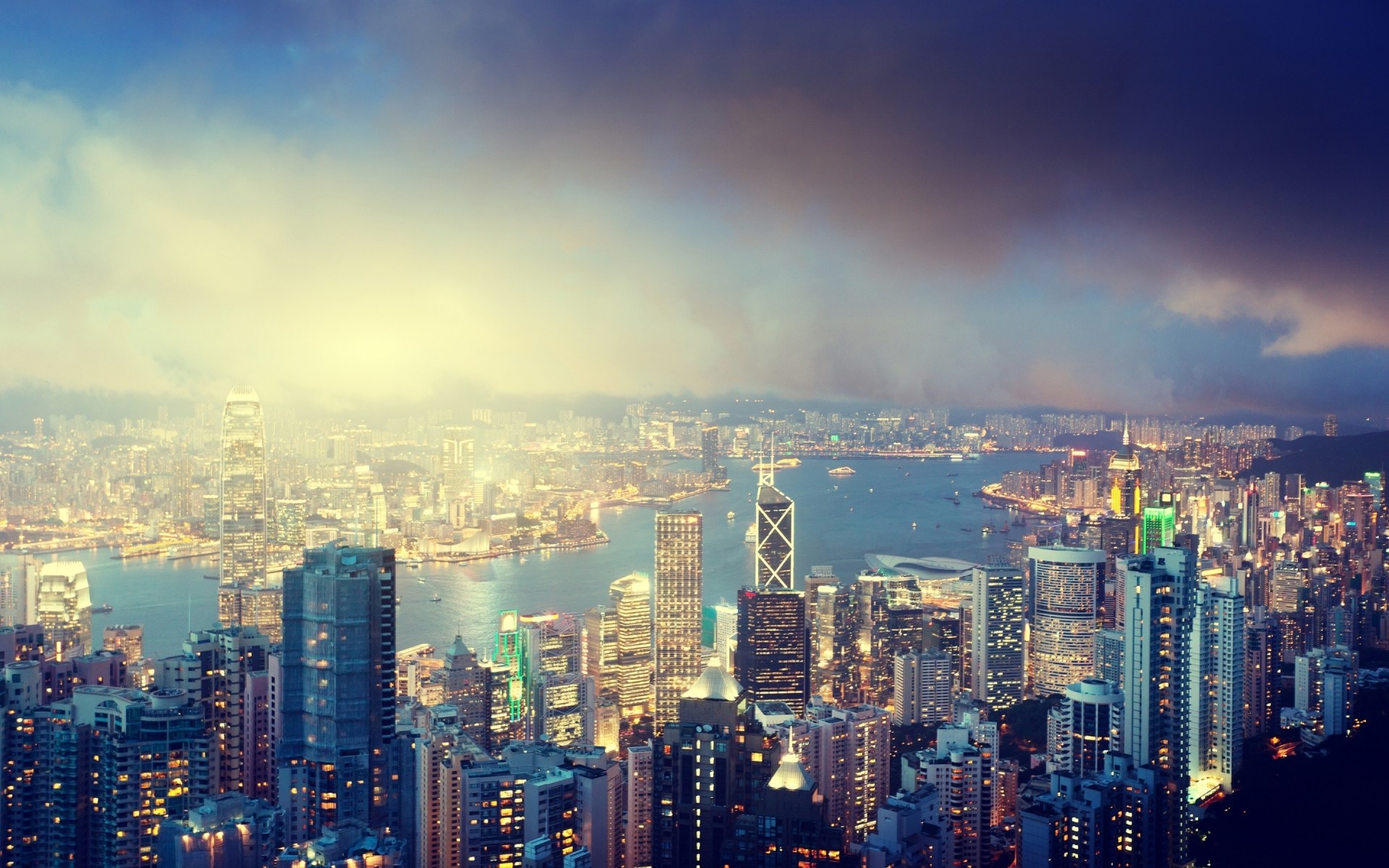 Magnifique vue de dessus sur les gratte-ciel de la métropole, baie, ciel nuageux