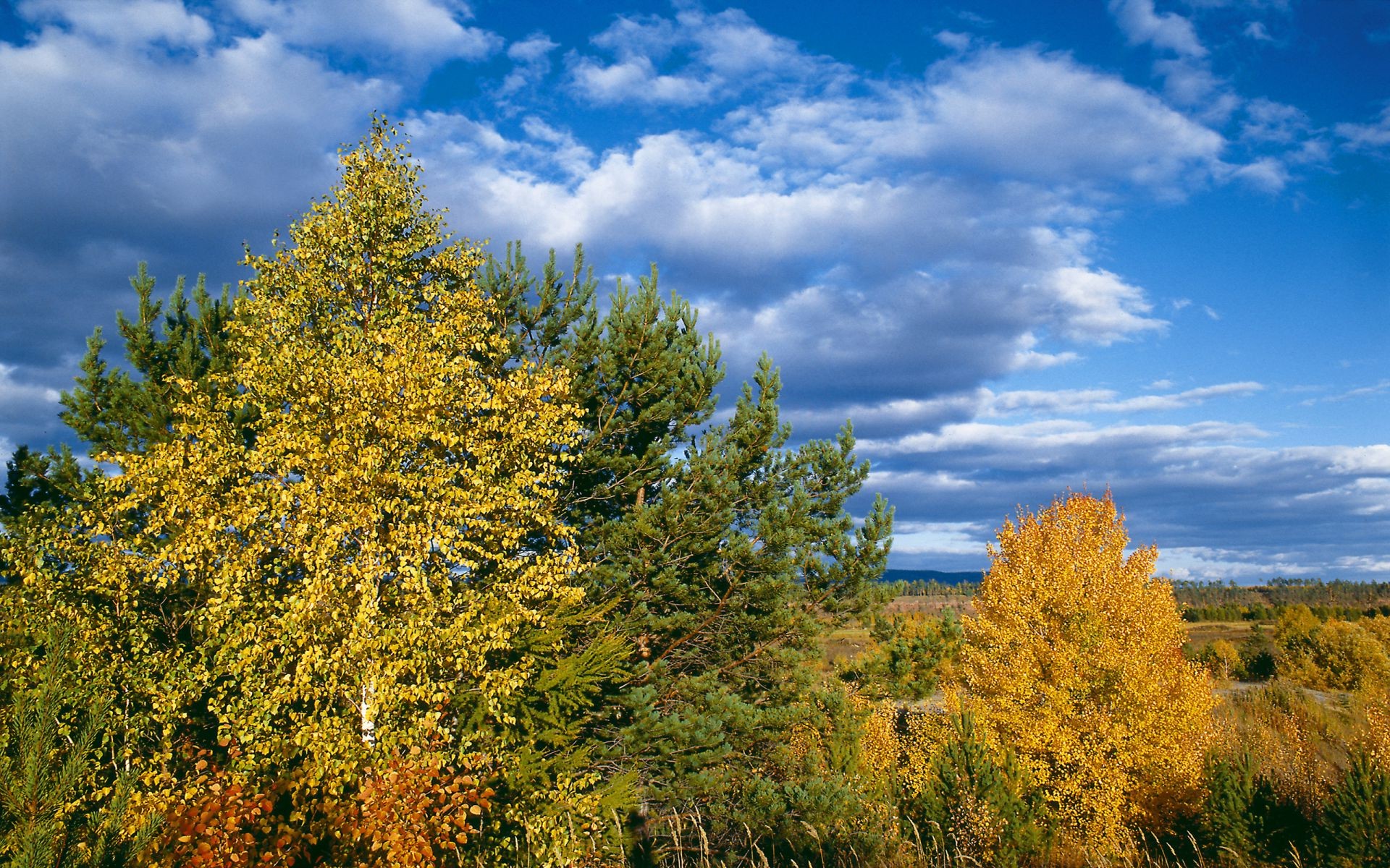 Variété de nuances d'automne. Arbres sur fond de beau ciel avec des nuages
