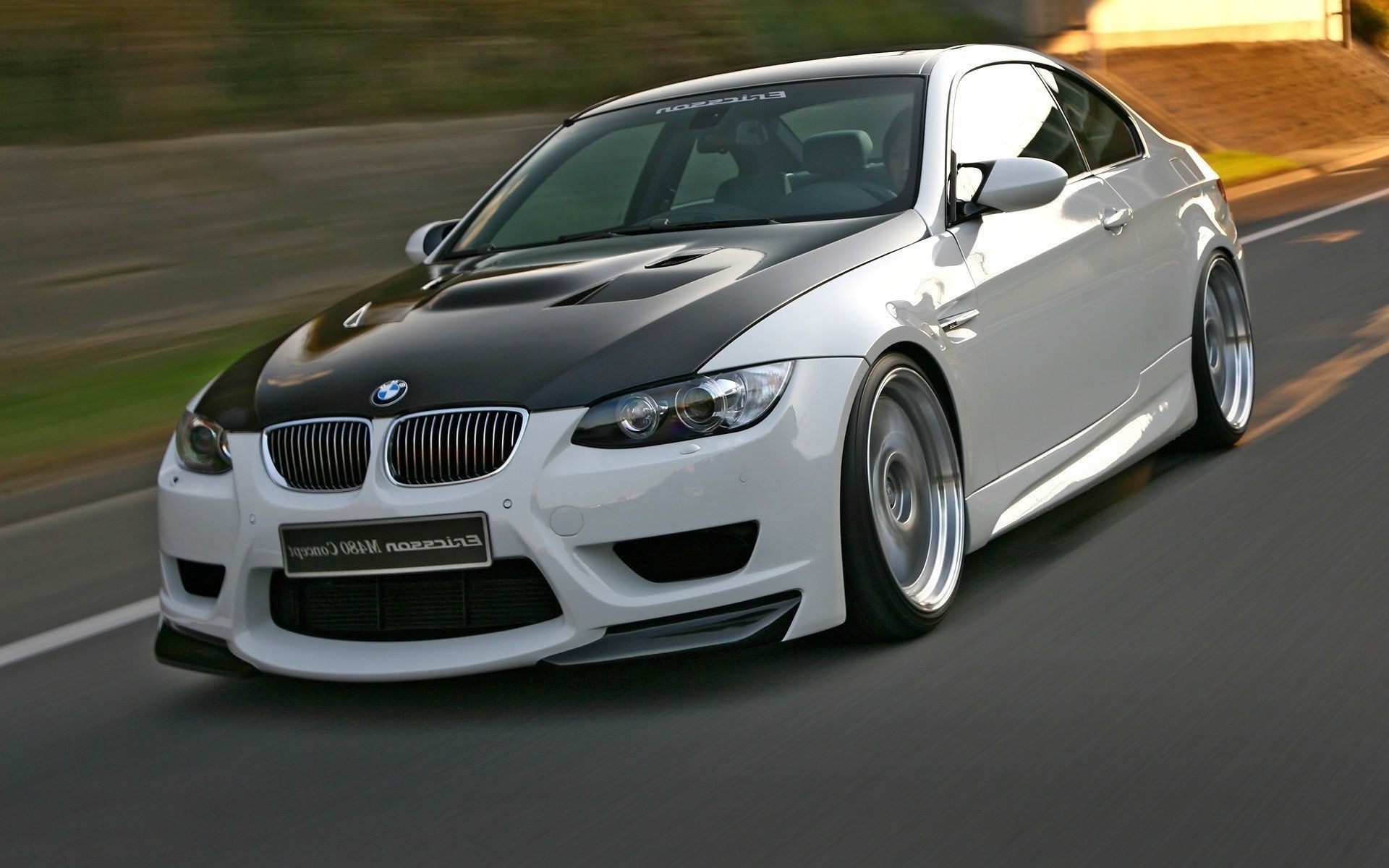 Une BMW blanche roule sur la route. Sur les côtés des arbres