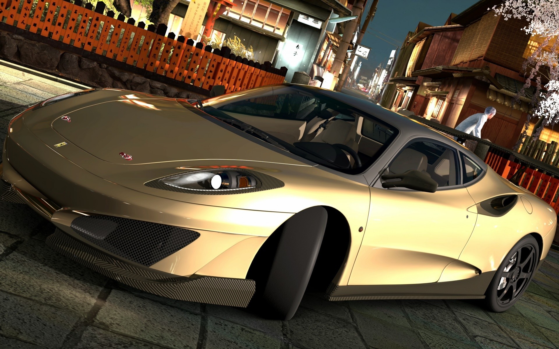 Voiture grise dans la rue du soir éclairée par des lanternes