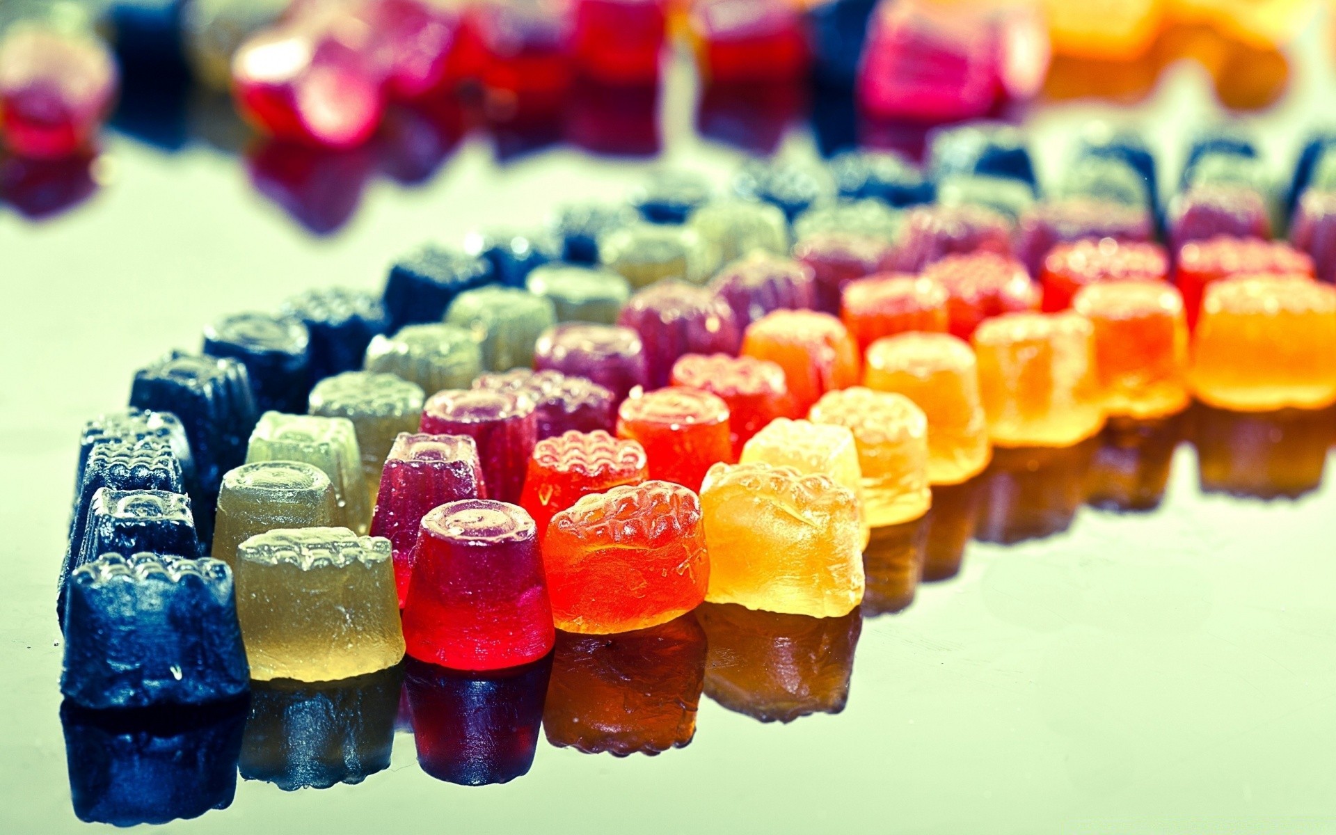 Jeune fille souriante se trouve sur l'herbe et tient des bonbons dans ses mains