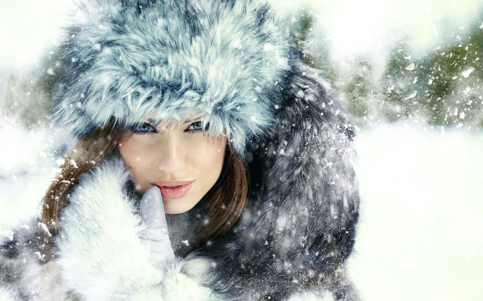 La jeune fille dans un chapeau moelleux est couverte de neige