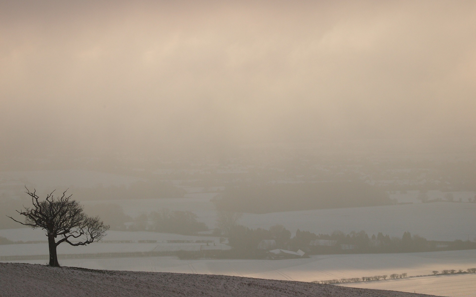 Arbre solitaire au bord d'une clairière dans le brouillard