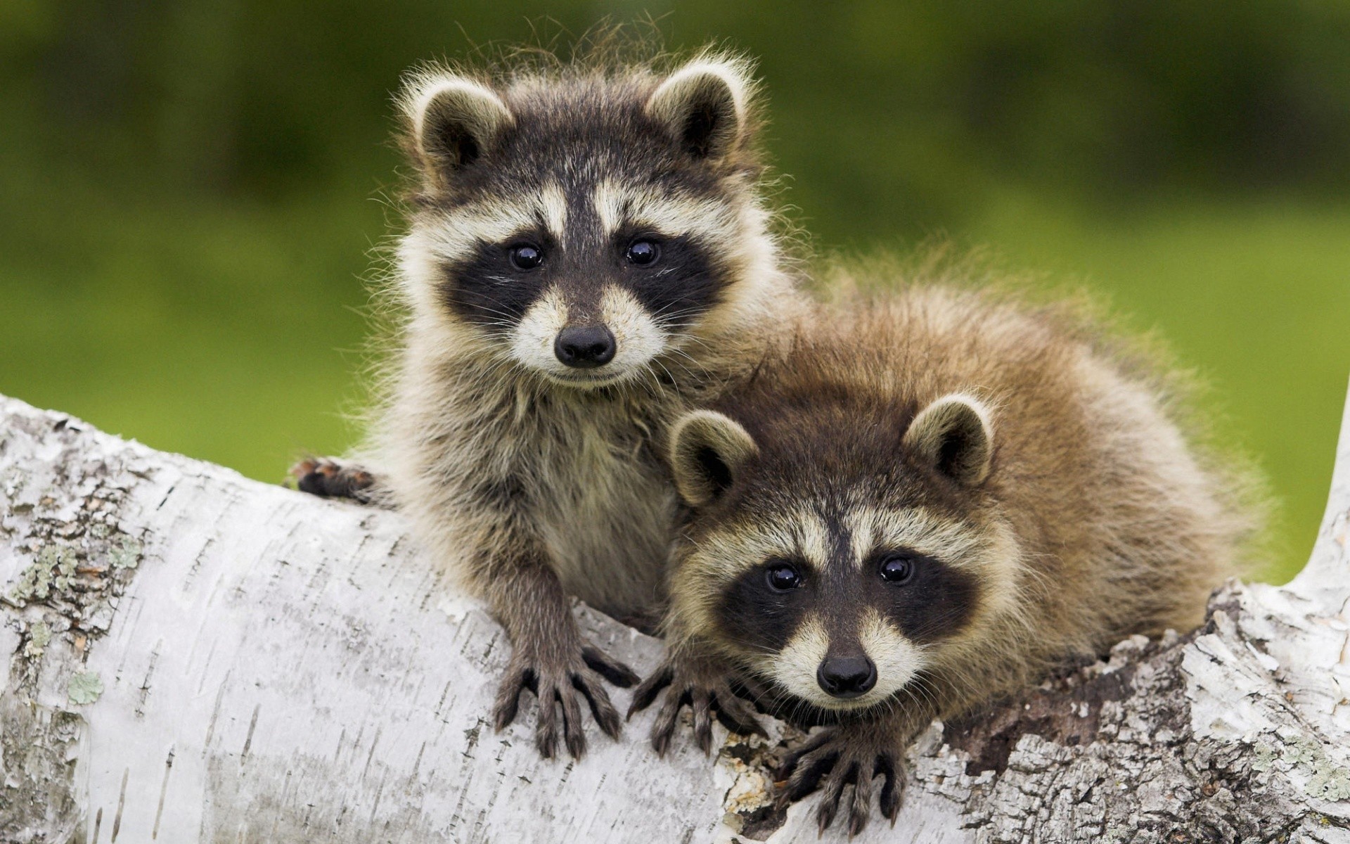 Deux ratons laveurs curieux sur un bouleau