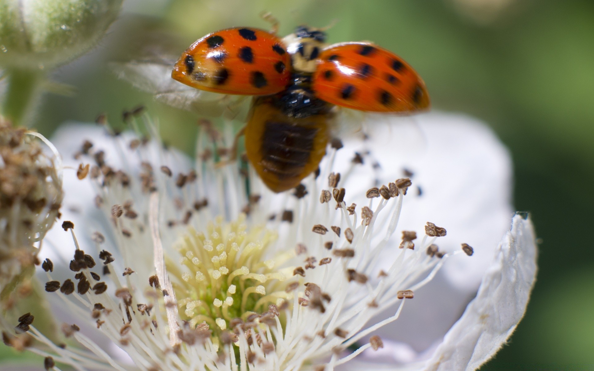 Coccinelle décolle d'une fleur blanche