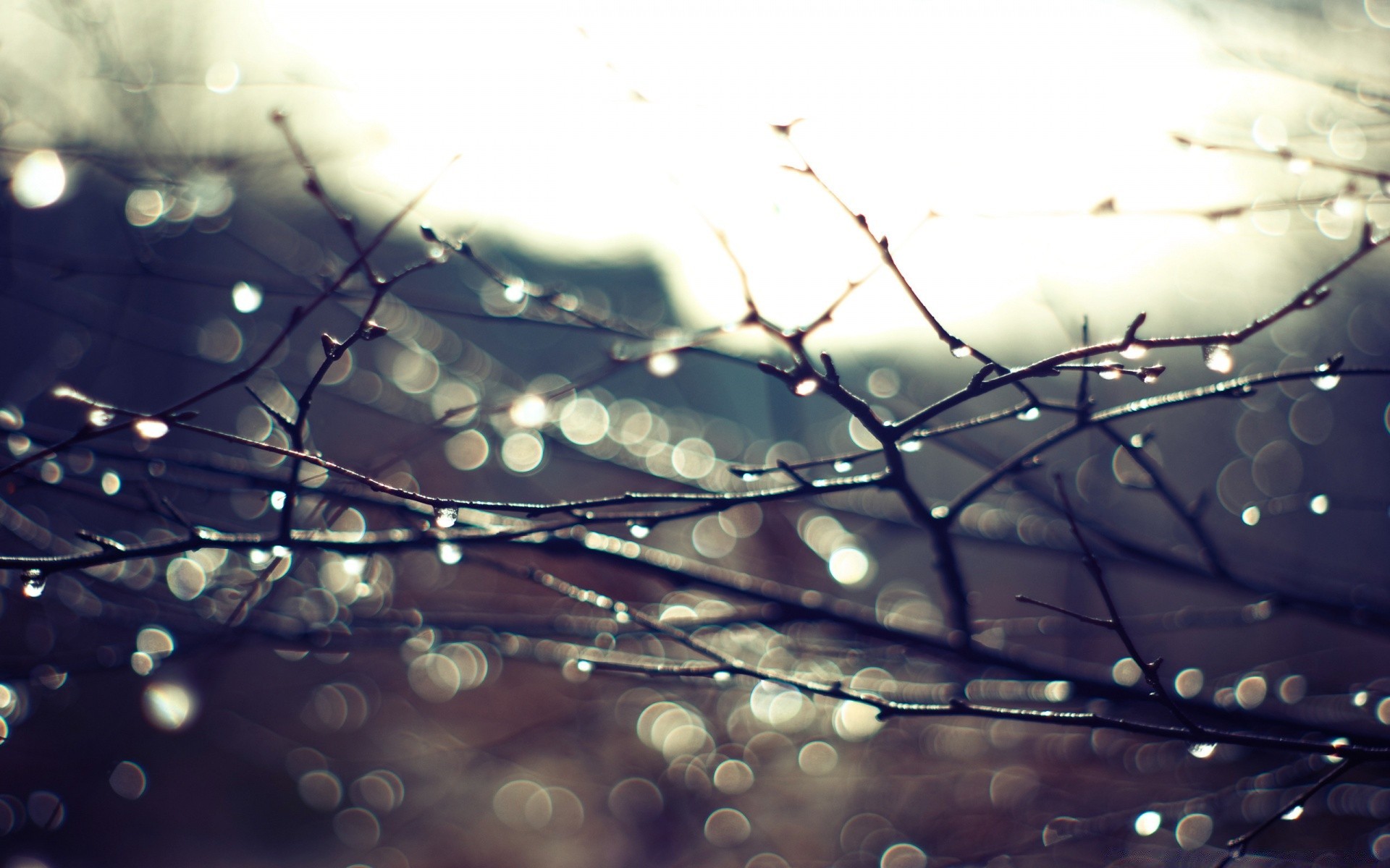 Branche d'arbre humide en gouttes sans feuilles sur fond flou