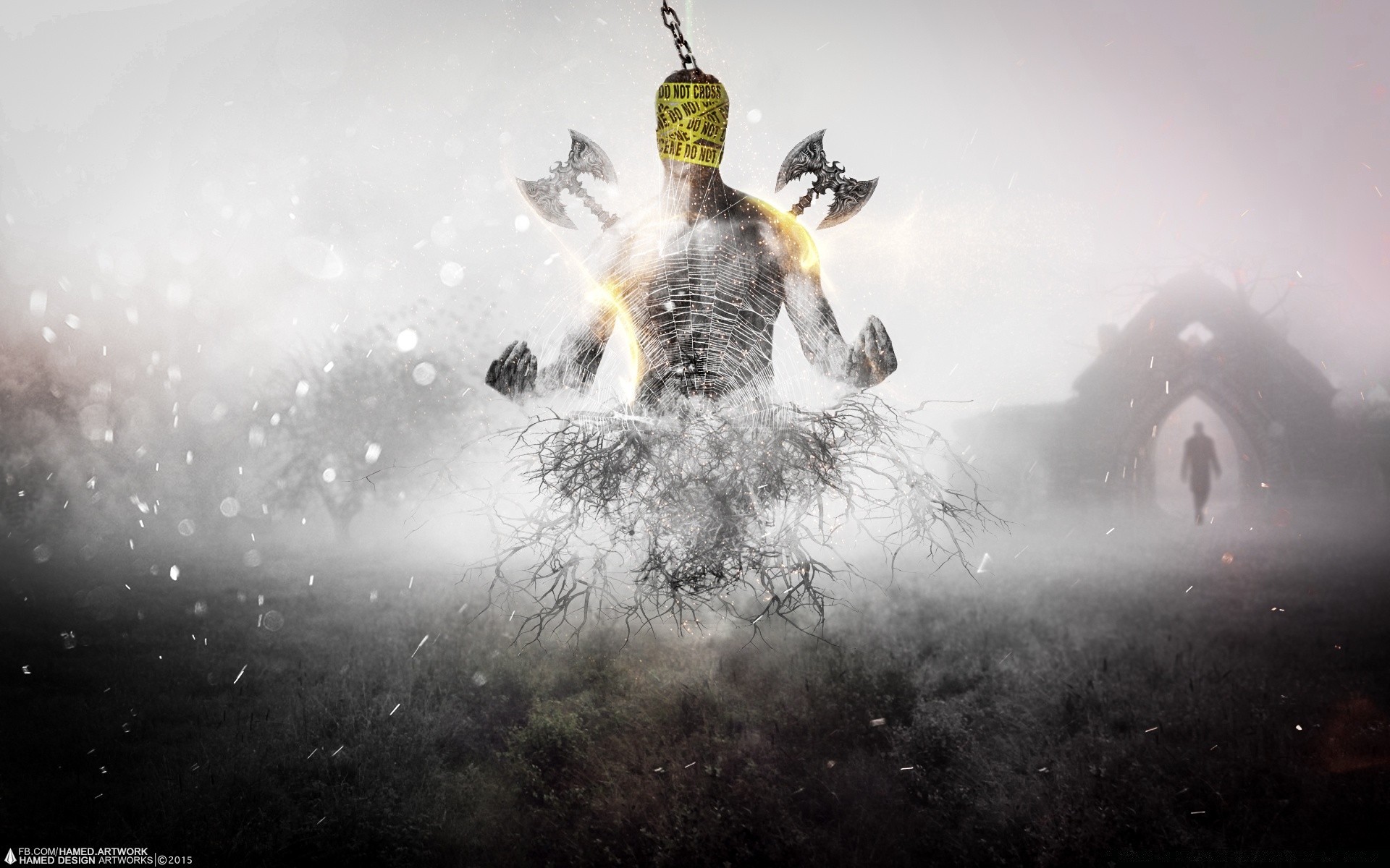 Guerrier sans visage avec des haches dans le brouillardGuerrier sans visage avec des haches dans le brouillard