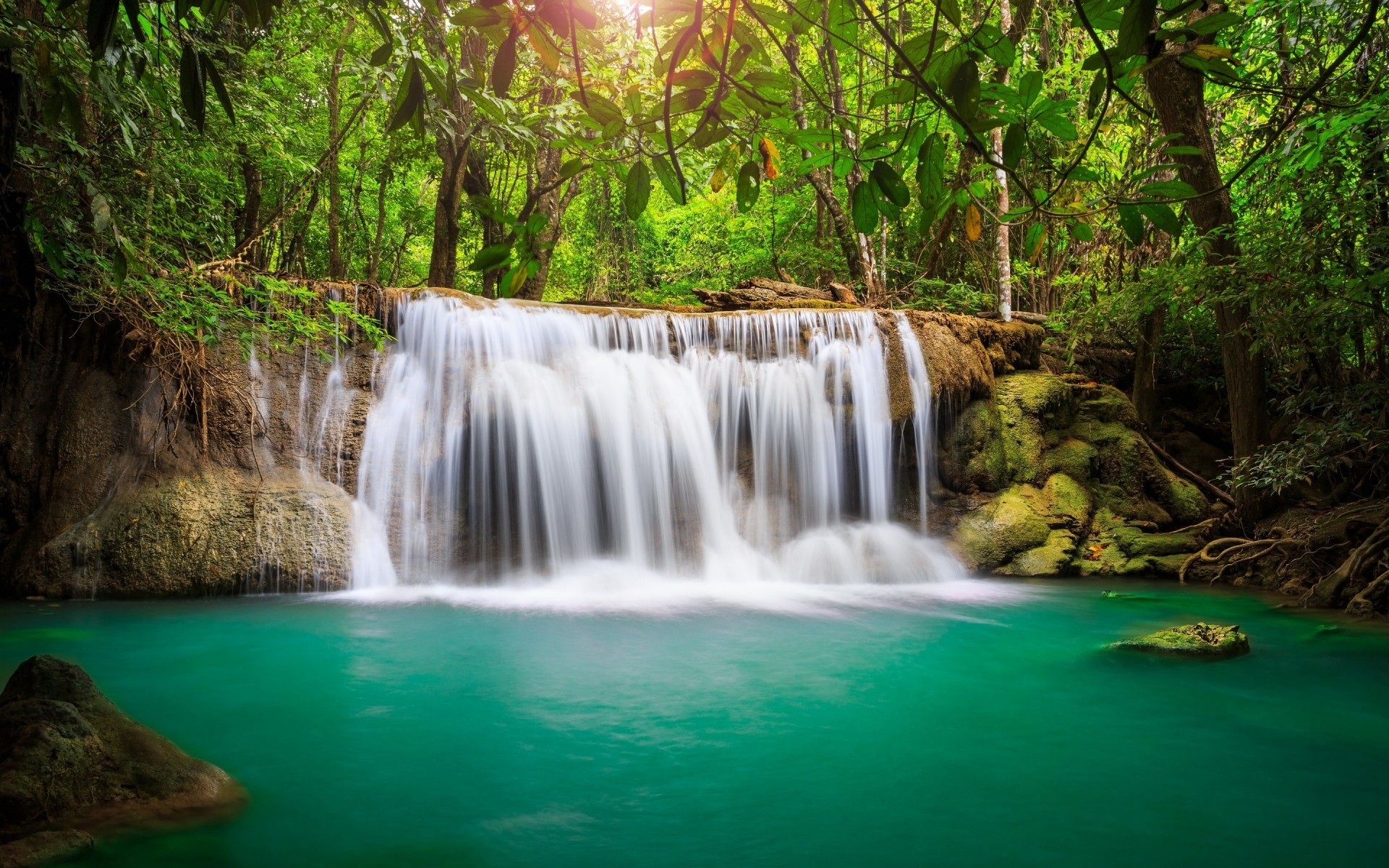 Sauvage. Montagnes vertes et cascade sur fond de ciel bleu