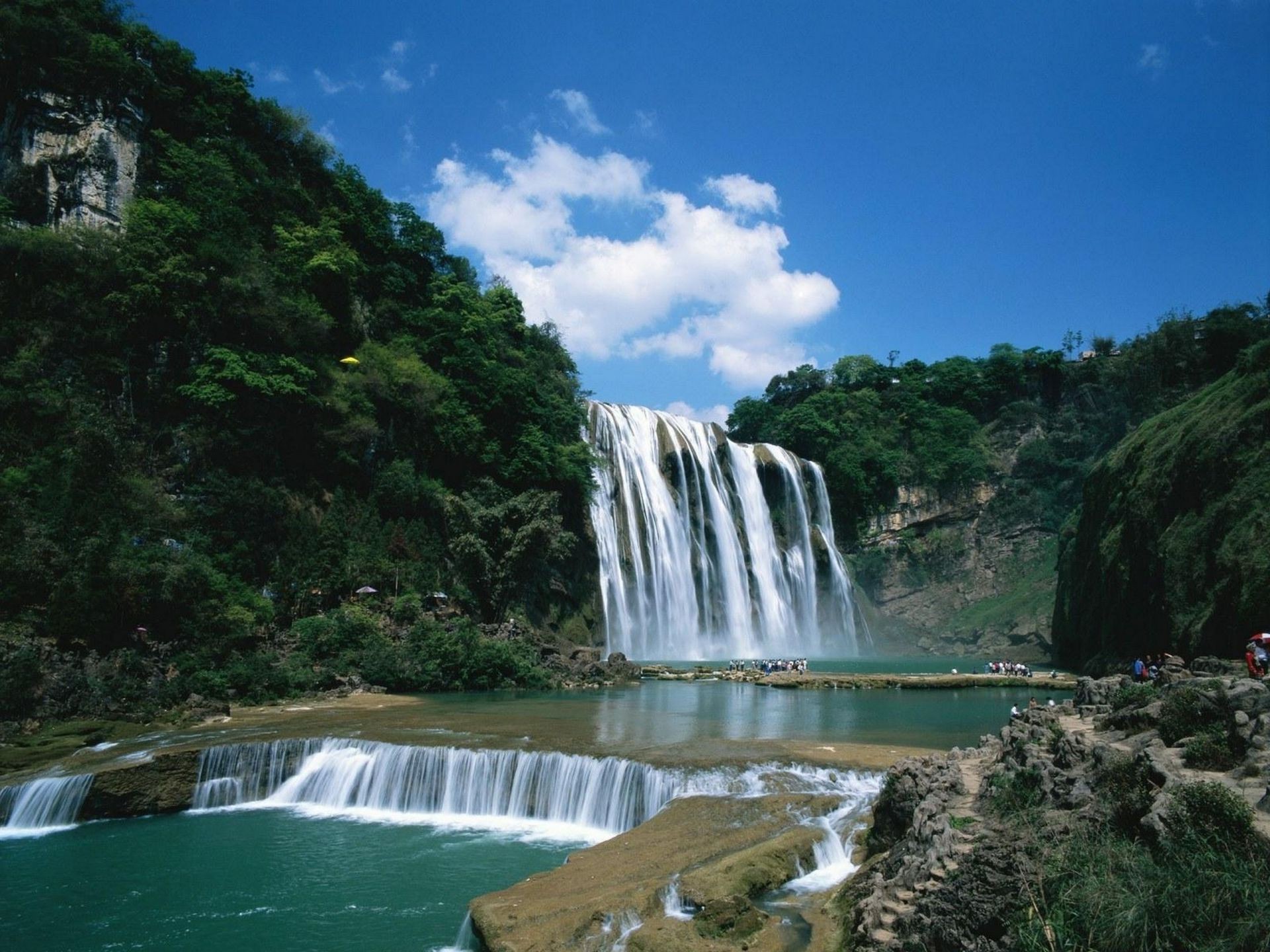 De minces jets de cascade lavent les arbres sur le flanc de la montagne