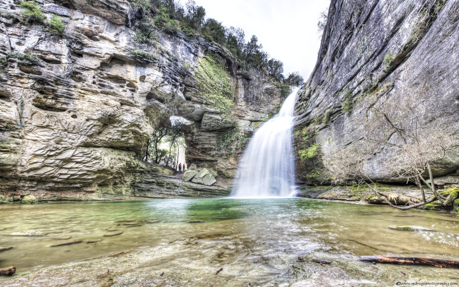 Les ruisseaux transparents de la cascade tombent sur la rive verte