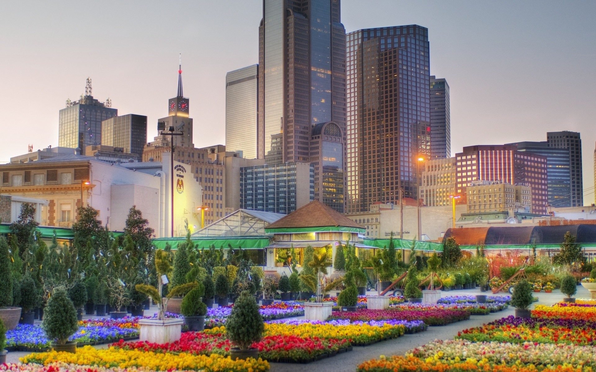Gratte-ciel du soir aux États-Unis au bord de l'eau