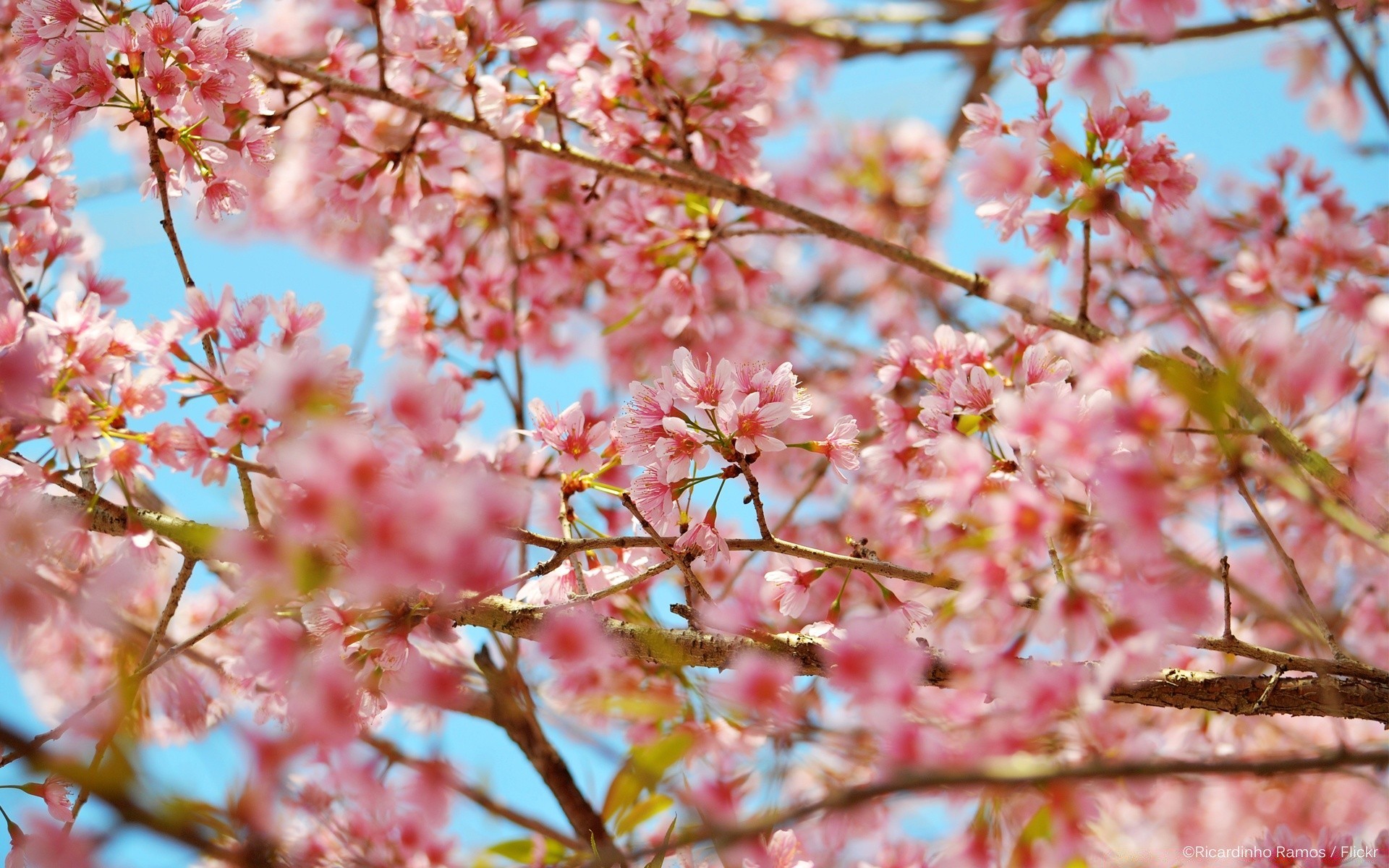 Branches de fleurs de cerisier sur fond de ciel bleu