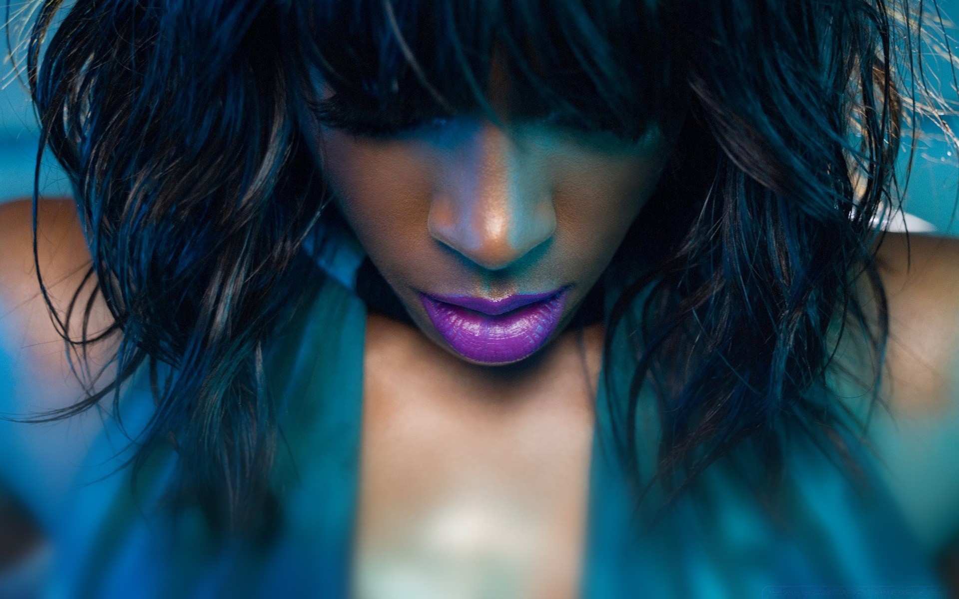 Sur fond bleu blonde en robe rouge et lettres anglaises