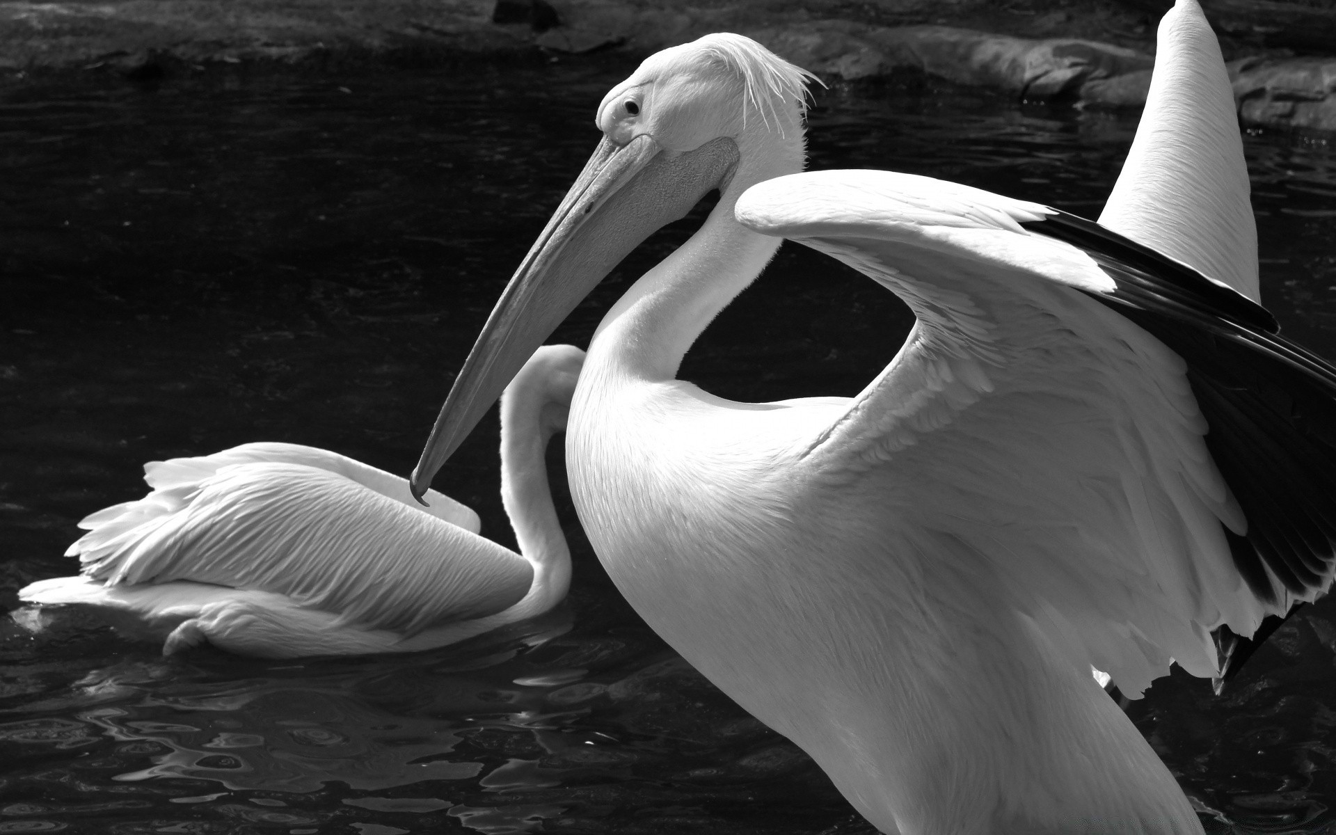 Pélicans dans l'eau en noir et blanc