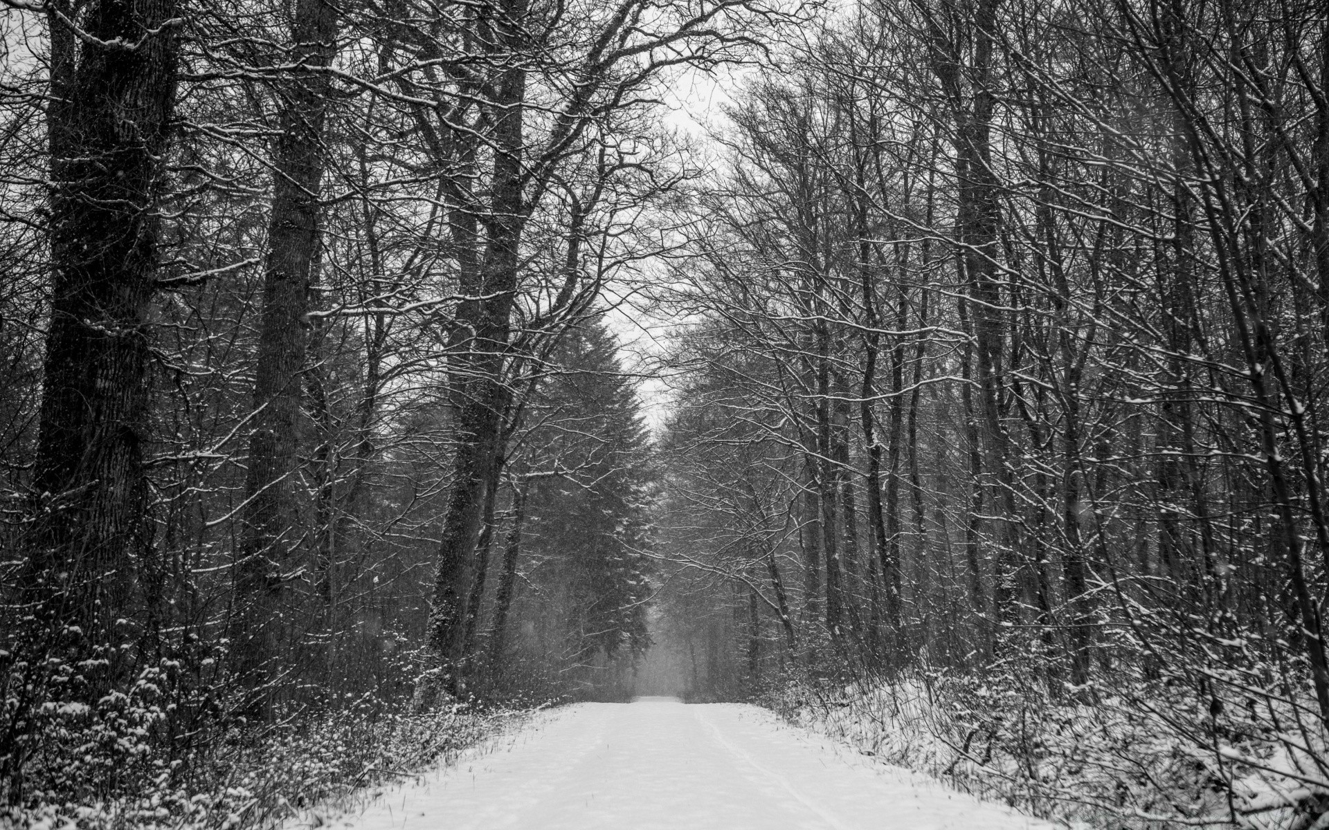 Photo en noir et blanc de la route forestière