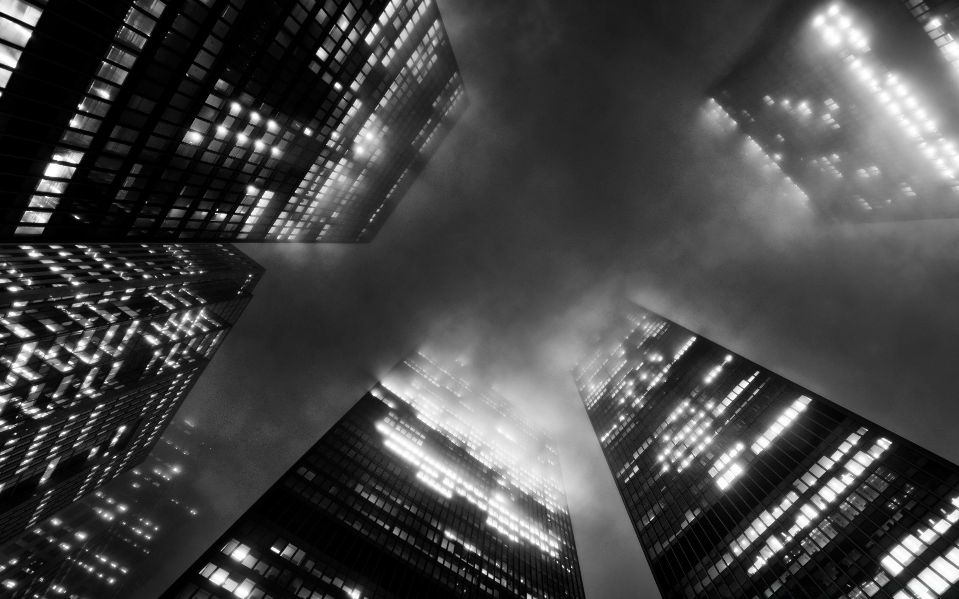 Photo noir et blanc représentant un Lynx d'hiver sur fond de maison et arbre