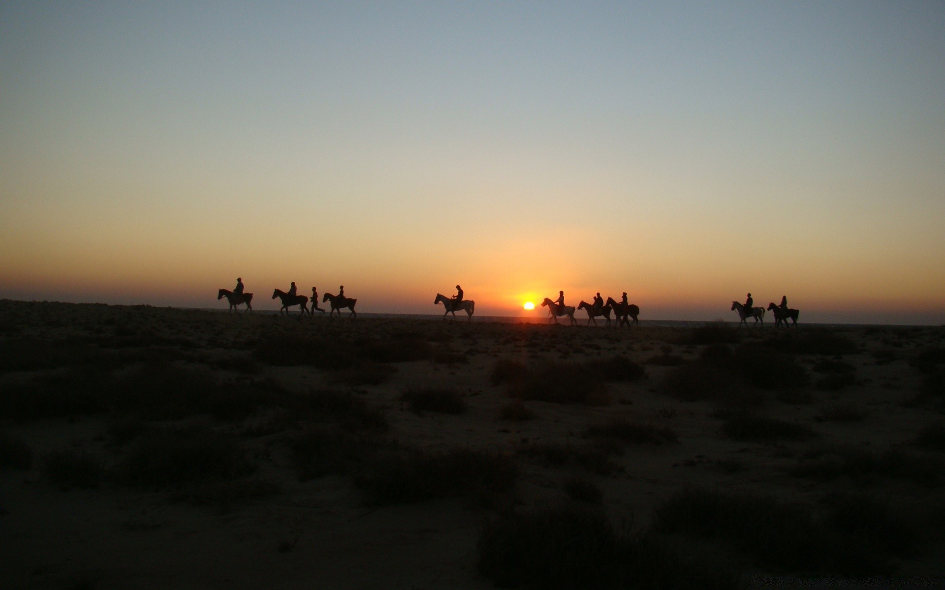 Cavalier sur un cheval dans les rayons du coucher du soleil