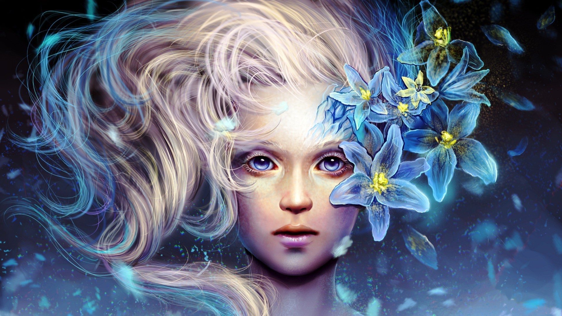 Fille avec de grands yeux et les cheveux bleus. Anime