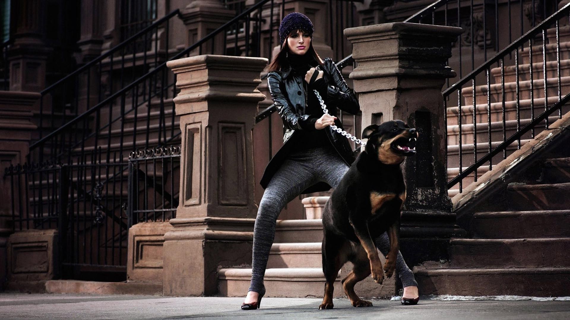 Fille tenant un gros chien en laisse