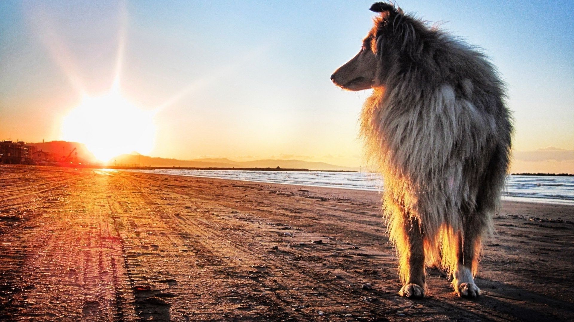 Fidèle chien attend sur le rivage tandis que le propriétaire se baigne dans la mer